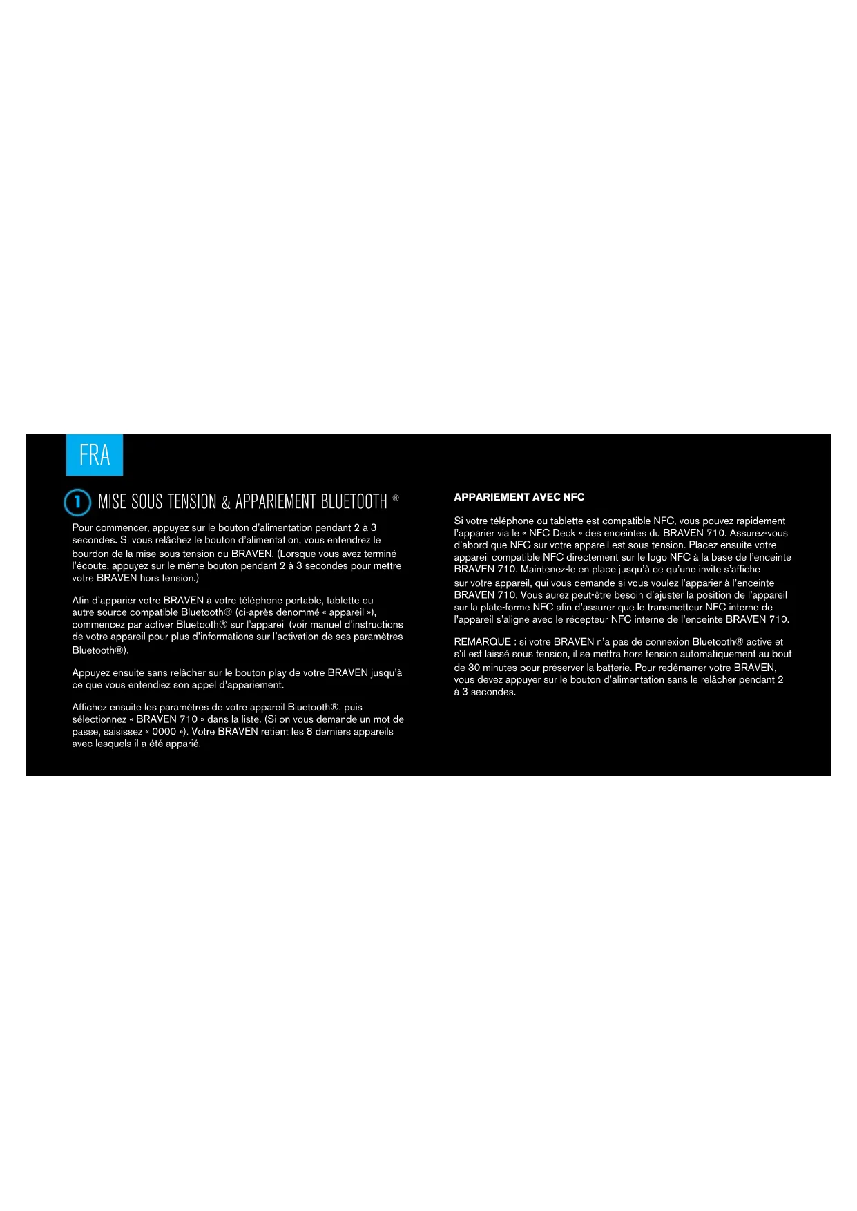 Si votre téléphone ou tablette est compatible NFC, vous pouvez rapidement l’apparier via le « NFC Deck » des enceintes du BRAVEN 710. Assurez-vous d’abord que NFC sur votre appareil est sous tension. Placez ensuite votre appareil compatible NFC directement sur le logo NFC à la base de l’enceinte BRAVEN 710. Maintenez-le en place jusqu’à ce qu’une invite s’affiche sur votre appareil, qui vous demande si vous voulez l’apparier à l’enceinte BRAVEN 710. Vous aurez peut-être besoin d’ajuster la position de l’appareil sur la plate-forme NFC afin d’assurer que le transmetteur NFC interne de l’appareil s’aligne avec le récepteur NFC interne de l’enceinte BRAVEN 710. REMARQUE : si votre BRAVEN n’a pas de connexion Bluetooth® active et s’il est laissé sous tension, il se mettra hors tension automatiquement au bout de 30 minutes pour préserver la batterie. Pour redémarrer votre BRAVEN, vous devez appuyer sur le bouton d’alimentation sans le relâcher pendant 2 à 3 secondes. FRA