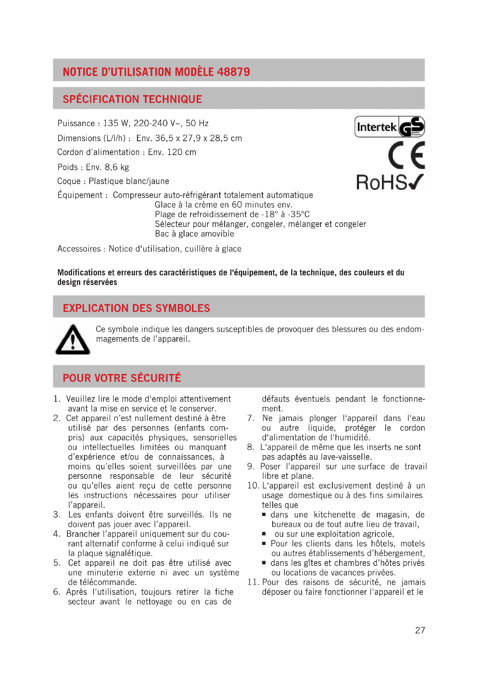 sPéciFication tEchniquE Puissance : 135 W, 220-240 V~, 50 Hz Dimensions (L/l/h) : Env. 36,5 x 27,9 x 28,5 cm Cordon d’alimentation : Env. 120 cm Poids : Env. 8,6 kg Coque : Plastique blanc/jaune Équipement : Compresseur auto-réfrigérant totalement automatique Glace à la crème en 60 minutes env. Plage de refroidissement de -18° à -35°C Sélecteur pour mélanger, congeler, mélanger et congeler Bac à glace amovible Accessoires : Notice d‘utilisation, cuillère à glace Modifications et erreurs des caractéristiques de l‘équipement, de la technique, des couleurs et du design réservées ExPlication DEs symbolEs Ce symbole indique les dangers susceptibles de provoquer des blessures ou des endom- magements de l’appareil. Pour VotrE sécurité