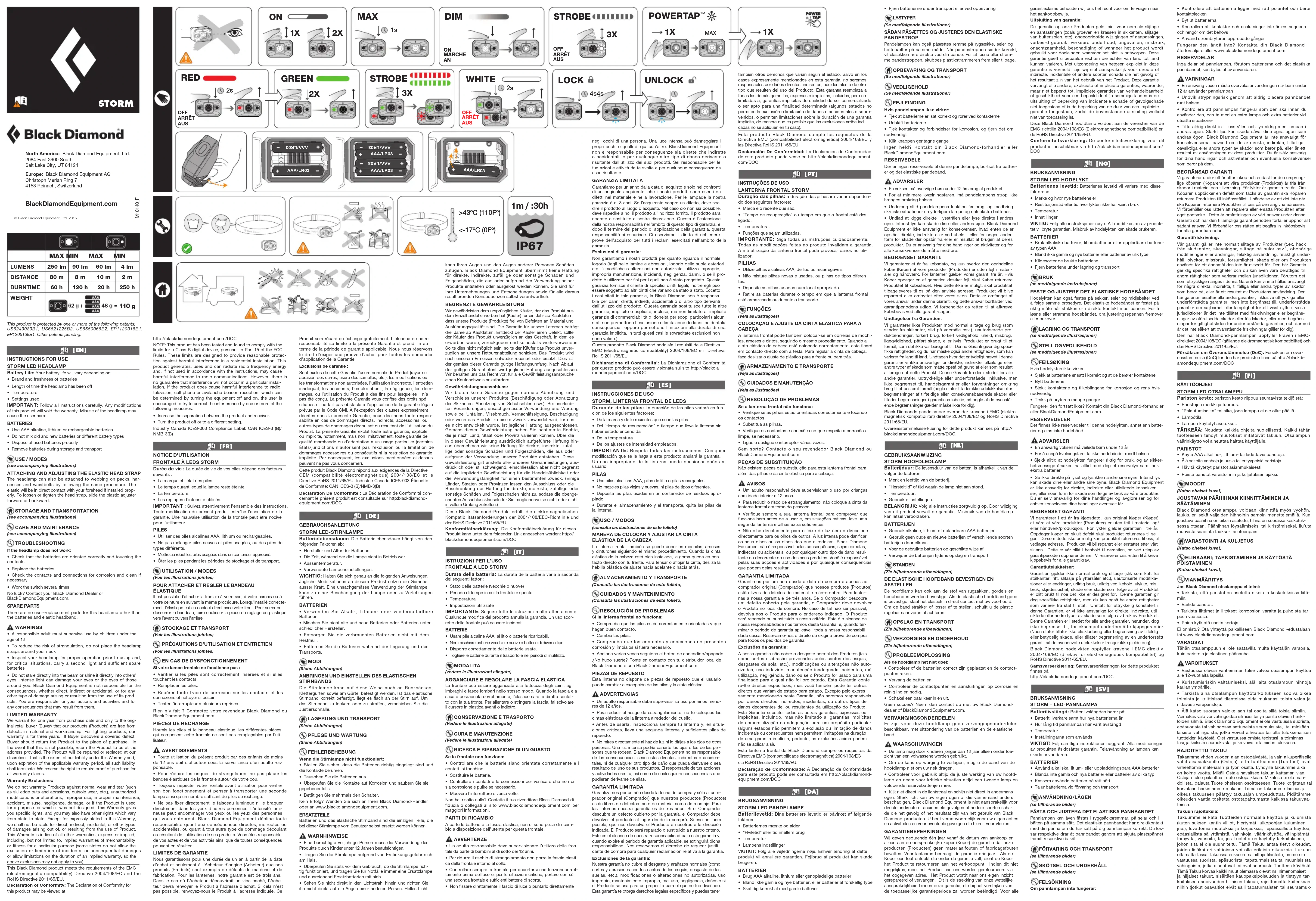 OFF ARRÊT AUS STORM © Black Diamond Equipment, Ltd. 2015M10140_F [EN]INSTRUCTIONS FOR USESTORM LED HEADLAMPBattery Life: Your battery life will vary depending on:• Brand and freshness of batteries• Length of time the headlamp has been off• Temperature• Settings usedIMPORTANT: Follow all instructions carefully. Any modifications of this product will void the warranty. Misuse of the headlamp may cause the user harm.BATTERIES • Use AAA alkaline, lithium or rechargeable batteries• Do not mix old and new batteries or different battery types• Dispose of used batteries properly• Remove batteries during storage and transportUSE / MODES(see accompanying illustrations) ATTACHING AND ADJUSTING THE ELASTIC HEAD STRAPThe headlamp can also be attached to webbing on packs, har-nesses and waistbelts by following the same procedure. The elastic will be in direct contact with your forehead if installed prop-erly. To loosen or tighten the head strap, slide the plastic adjuster forward or backward.STORAGE AND TRANSPORTATION(see accompanying illustrations) CARE AND MAINTENANCE(see accompanying illustrations) TROUBLESHOOTINGIf the headlamp does not work:• Check that the batteries are oriented correctly and touching the contacts• Replace the batteries• Check the contacts and connections for corrosion and clean if necessary• Work the switch several timesNo luck? Contact your Black Diamond Dealer or BlackDiamondEquipment.com.SPARE PARTSThere are no user-replacement parts for this headlamp other than the batteries and elastic headband. WARNINGS• A responsible adult must supervise use by children under the age of 12• To reduce the risk of strangulation, do not place the headlamp straps around your neck• Inspect your headlamp for proper operation prior to using and, for critical situations, carry a second light and sufficient spare batteries• Do not stare directly into the beam or shine it directly into others’ eyes. Intense light can damage your eyes or the eyes of those around you. Black Diamond Equipment is not responsible for the consequences, whether direct, indirect or accidental, or for any other type of damage arising or resulting from the use of its prod-ucts. You are responsible for your actions and activities and for any consequences that may result from them.LIMITED WARRANTYWe warrant for one year from purchase date and only to the orig-inal retail buyer (Buyer) that our products (Products) are free from defects in material and workmanship. For lighting products, our warranty is for three years. If Buyer discovers a covered defect, Buyer should return the Product to the place of purchase. In the event that this is not possible, return the Product to us at the address provided. The Product will be repaired or replaced at our discretion. That is the extent of our liability under this Warranty and, upon expiration of the applicable warranty period, all such liability shall terminate. We reserve the right to require proof of purchase for all warranty claims.Warranty Exclusions: We do not warranty Products against normal wear and tear (such as ski edge cuts and abrasions, outsole wear, etc.), unauthorized modifications or alterations, improper use, improper maintenance, accident, misuse, negligence, damage, or if the Product is used for a purpose for which it was not designed. This Warranty gives you specific rights, and you may also have other rights which vary from state to state. Except for expressly stated in this Warranty, we shall not be liable for direct, indirect, incidental, or other types of damages arising out of, or resulting from the use of Product. This Warranty is in lieu of all other warranties, express or implied, including, but not limited to, implied warranties of merchantability or fitness for a particular purpose (some states do not allow the exclusion or limitation of incidental or consequential damages or allow limitations on the duration of an implied warranty, so the above exclusions may not apply to you).This Black Diamond product meets the requirements of the EMC (electromagnetic compatibility) Directive 2004/108/EC and the RoHS Directive 2011/65/EU. Declaration of Conformity: The Declaration of Conformity for this product may be viewed at http://blackdiamondequipment.com/DOCNOTE: This product has been tested and found to comply with the limits for a Class B digital device, pursuant to Part 15 of the FCC Rules. These limits are designed to provide reasonable protec-tion against harmful interference in a residential installation. This product generates, uses and can radiate radio frequency energy and, if not used in accordance with the instructions, may cause harmful interference to radio communications. However, there is no guarantee that interference will not occur in a particular instal-lation. If the product does cause harmful interference to radio, television, cell phone or avalanche beacon reception, which can be determined by turning the equipment off and on, the user is encouraged to try to correct the interference by one or more of the following measures:• Increase the separation between the product and receiver.• Turn the product off or to a different setting.Industry Canada ICES-003 Compliance Label: CAN ICES-3 (B)/NMB-3(B) [FR]NOTICE D’UTILISATIONFRONTALE À LEDS STORMDurée de vie : La durée de vie de vos piles dépend des facteurs suivants :• La marque et l’état des piles.• Le temps durant lequel la lampe reste éteinte.• La température.• Les réglages d’intensité utilisés.IMPORTANT : Suivez attentivement l’ensemble des instructions. Toute modification du présent produit entraîne l’annulation de la garantie. Une mauvaise utilisation de la frontale peut être nocive pour l’utilisateur.PILES• Utiliser des piles alcalines AAA, lithium ou rechargeables.• Ne pas mélanger piles neuves et piles usagées, ou des piles de types différents.• Mettre au rebut les piles usagées dans un conteneur approprié.