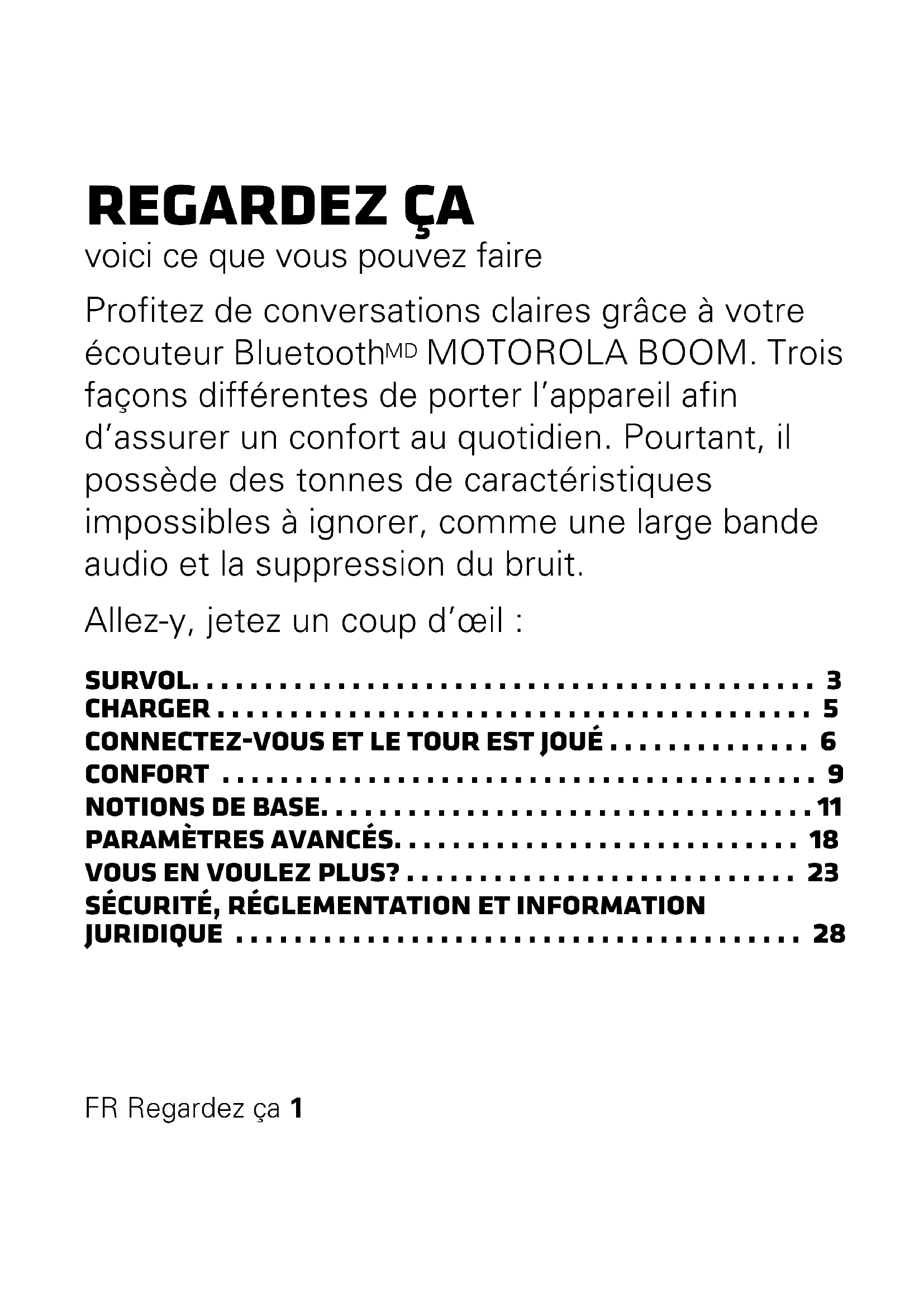 - MOTOROLA BOOM. Trois façons différentes de porter l’appareil afin d’assurer un confort au quotidien. Pourtant, il possède des tonnes de caractéristiques impossibles à ignorer, comme une large bande audio et la suppression du bruit. Allez-y, jetez un coup d’œil : Survol p. 3