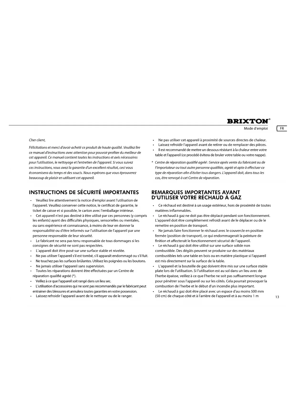 - Centre de réparation qualié agréé : Service après vente du fabricant ou de l’importateur ou tout autre personne qualiée, agréé et apte à eectuer ce type de réparation an d’éviter tous dangers. L'appareil doit, dans tous les cas, être renvoyé à cet Centre de réparation. remarques importantes avant d’utiliser votre réchaud à Gaz