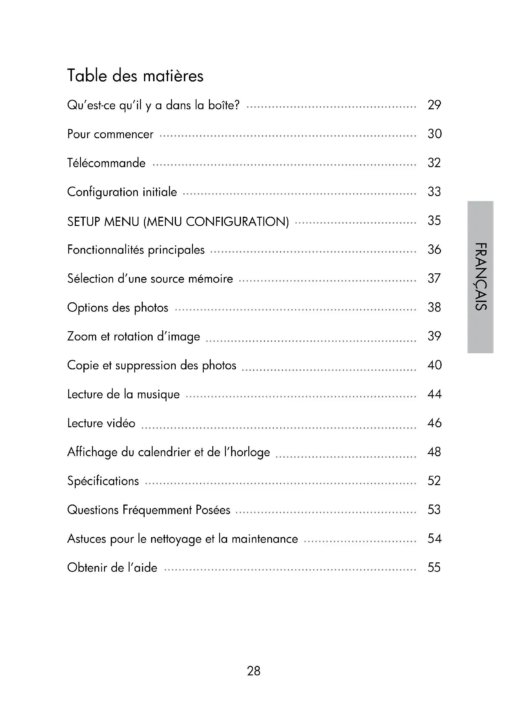 Table des matières Qu’est-ce qu’il y a dans la boîte? Pour commencer Télécommande Configuration initiale SETUP MENU (MENU CONFIGURATION) Fonctionnalités principales Sélection d’une source mémoire Options des photos Zoom et rotation d’image Copie et suppression des photos Lecture de la musique Lecture vidéo Affichage du calendrier et de l’horloge Spécifications Questions Fréquemment Posées Astuces pour le nettoyage et la maintenance Obtenir de l’aide
