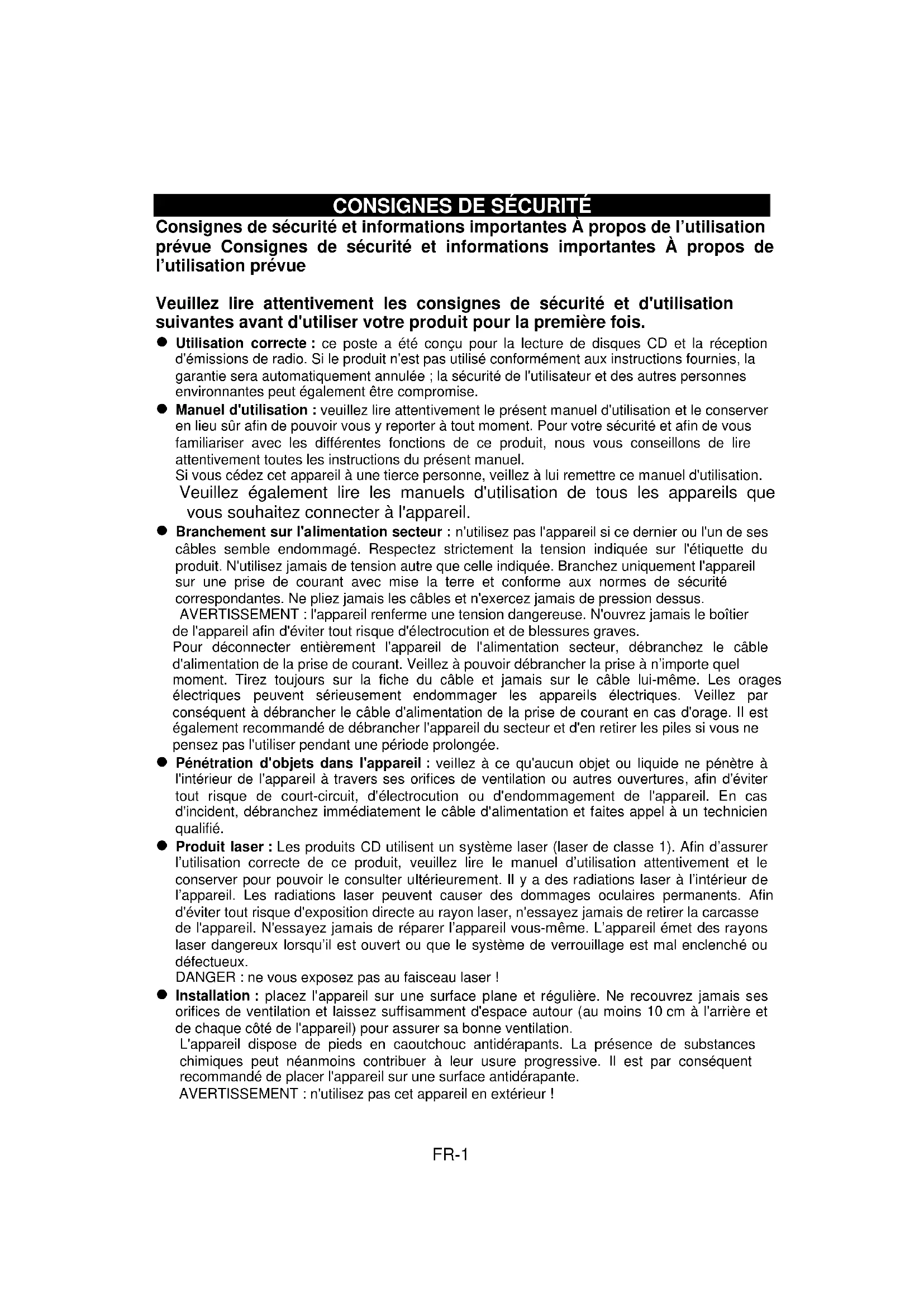 de l'appareil afin d'éviter tout risque d'électrocution et de blessures graves. Pour déconnecter entièrement l'appareil de l'alimentation secteur, débranchez le câble d'alimentation de la prise de courant. Veillez à pouvoir débrancher la prise à n’importe quel moment. Tirez toujours sur la fiche du câble et jamais sur le câble lui-même. Les orages électriques peuvent sérieusement endommager les appareils électriques. Veillez par conséquent à débrancher le câble d'alimentation de la prise de courant en cas d'orage. Il est également recommandé de débrancher l'appareil du secteur et d'en retirer les piles si vous ne pensez pas l'utiliser pendant une période prolongée. Pénétration d'objets dans l'appareil : veillez à ce qu'aucun objet ou liquide ne pénètre à l'intérieur de l'appareil à travers ses orifices de ventilation ou autres ouvertures, afin d'éviter tout risque de court-circuit, d'électrocution ou d'endommagement de l'appareil. En cas d'incident, débranchez immédiatement le câble d'alimentation et faites appel à un technicien qualifié. Produit laser : Les produits CD utilisent un système laser (laser de classe 1). Afin d’assurer l’utilisation correcte de ce produit, veuillez lire le manuel d’utilisation attentivement et le conserver pour pouvoir le consulter ultérieurement. Il y a des radiations laser à l’intérieur de l’appareil. Les radiations laser peuvent causer des dommages oculaires permanents. Afin d'éviter tout risque d'exposition directe au rayon laser, n'essayez jamais de retirer la carcasse de l'appareil. N'essayez jamais de réparer l’appareil vous-même. L’appareil émet des rayons laser dangereux lorsqu’il est ouvert ou que le système de verrouillage est mal enclenché ou défectueux.