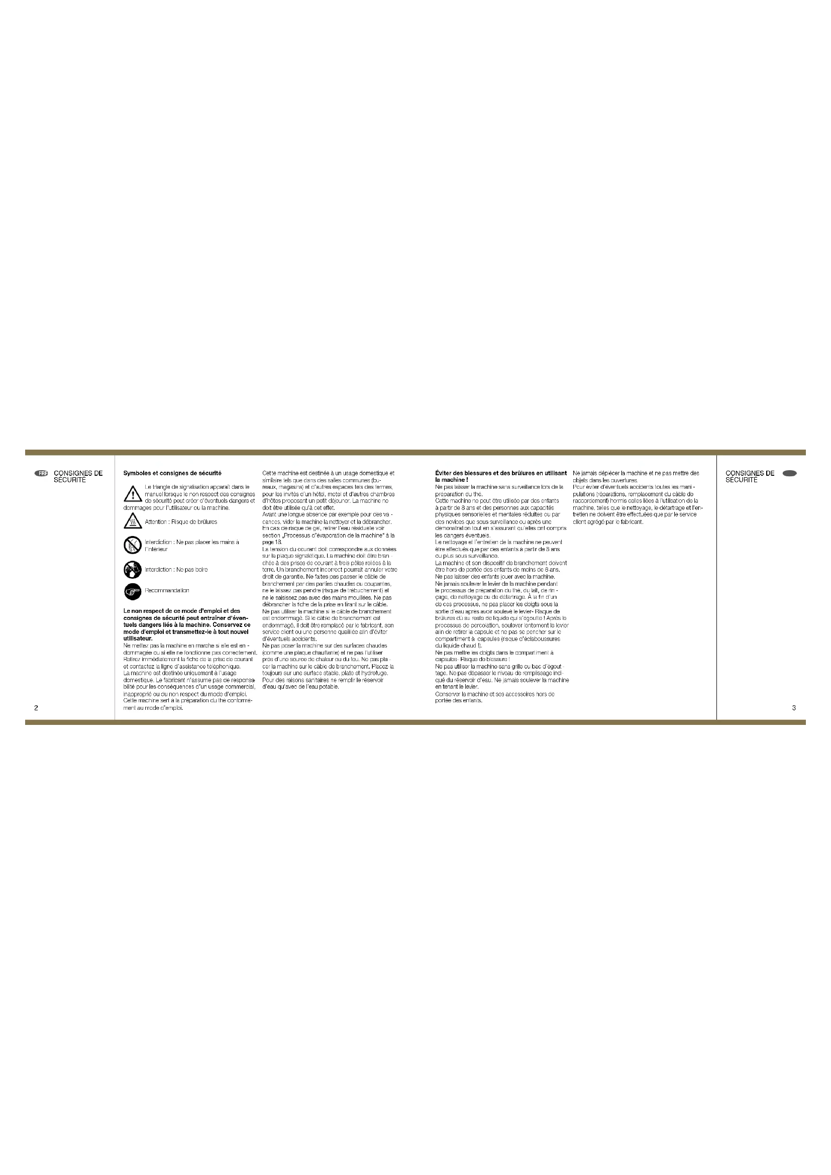 oujour s sur une surface stable, plate et hydrofuge. Pour des raisons sanitaires ne remplir le réservoir d’eau qu’avec de l’eau potable. Éviter des blessures et des brûlures en utilisant la machine ! Ne pas laisser la machine sans surveillance lors de la préparation du thé. Cette machine ne peut être utilisée par des enfants à partir de 8 ans et des personnes aux capacités physiques sensorielles et mentales réduites ou par des novices que sous surveillance ou après une démonstration tout en s’assurant qu’elles ont compris les dangers éventuels. Le nettoyage et l’entretien de la machine ne peuvent être effectués que par des enfants à partir de 8 ans ou plus sous surveillance. La machine et son dispositif de branchement doivent être hors de portée des enfants de moins de 8 ans. Ne pas laisser des enfants jouer avec la machine. Ne jamais soulever le levier de la machine pendant le processus de préparation du thé, du lait, de rin