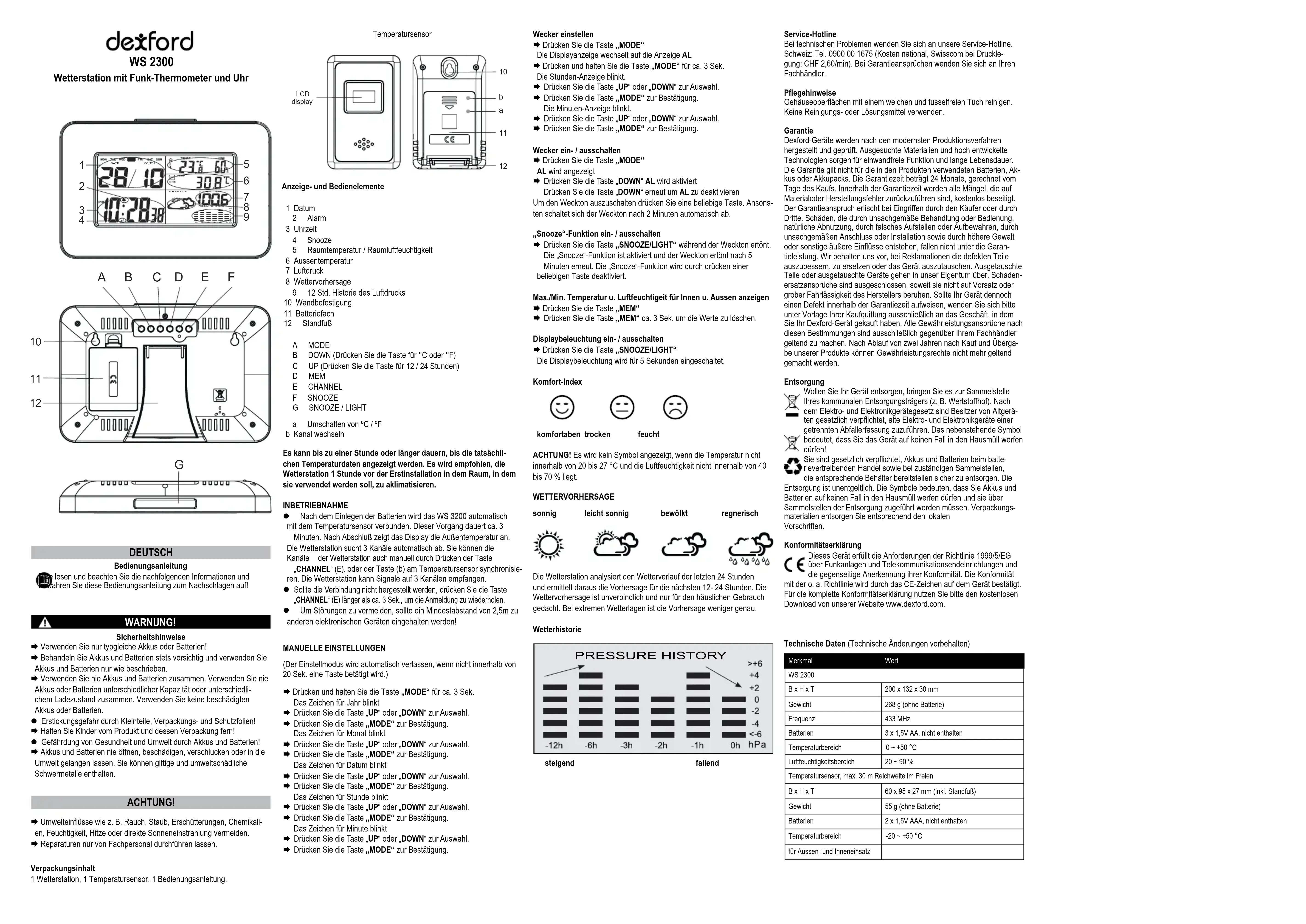 PRESSURE HISTORY steigend fallendATTENTION ! AVERTISSEMENT! Ligne d‘assistance directe En cas de problèmes techniques, adressez-vous à notre ligne d‘assistance directe. Suisse : Tél. 0900 00 1675 (frais Swisscom à l‘impression de ce moded‘emploi:CHF2,60/min).Encasderecoursengarantie,adressez- vous à votre revendeur. Remarques d‘entretien Nettoyez les surfaces du boîtier avec un chiffon doux et non pelucheux. N‘utilisez pas de produits d‘entretien ou de solvants. Garantie Les appareils Dexford sont contrôlés et fabriqués suivant les meilleurs procédés. Des matériaux sélectionnés et des technologies de pointe leur garantissent un fonctionnement irréprochable et une longue durée de vie. La garantie ne s‘applique pas aux piles et piles rechargeables utilisées danslesproduits.Laduréedelagarantieestde24moisàpartirdeladate d‘achat. Pendant la durée de la garantie, tous les défauts dus à des vices de matériel ou de fabrication seront éliminés gratuitement. Le droit à la garantie expire en cas d‘intervention de l‘acheteur ou de tiers. Les dommages provenant d‘un maniement ou d‘une manipulation incorrects, d‘une usure naturelle, d‘une mauvaise mise en place ou d‘une mauvaise conservation, d‘un raccordement ou d‘une installation incorrects ainsi que d‘uncasdeforcemajeureouautresinuencesextérieuressontexclus de la garantie. En cas de réclamations, nous nous réservons le droit de réparer, de remplacer les pièces défectueuses ou d‘échanger l‘appareil. Les composants remplacés ou les appareils échangés deviennent notre propriété. Les demandes de dommages et intérêts sont exclues tant que les défauts ne reposent pas sur une faute intentionnelle ou une négligence grossière du fabricant. Si votre appareil Dexford présente cependant un défaut pendant la période de garantie, veuillez vous adresser exclusive- ment au magasin où vous l‘avez acheté en présentant votre bon d‘achat. Vous ne pouvez faire valoir vos droits à la garantie répondant à ces dispositions qu‘exclusivement auprès de votre revendeur. Deux ans après l‘achat et la remise de nos produits, il n‘est plus possible de faire valoir les droits à la garantie. Mettre l‘appareil au rebut Si vous ne voulez plus servir de votre appareil, veuillez l‘apporter au centre de collecte de l‘organisme de traitement des déchets de votre commune(parex.centrederecyclage).D‘aprèslaloirelativeaux appareils électriques et électroniques, les propriétaires d‘appareils usagés sont tenus de mettre tous les appareils électriques et électroniques usagés dans un collecteur séparé. L‘icône ci-contre signiequevousnedevezenaucuncasjetervotreappareildans les ordures ménagères ! Vous êtes tenus par la loi d‘éliminer vos piles et piles rechargeables auprès d‘un revendeur de piles ainsi qu‘auprès de centres de collecte responsables de leur élimination qui mettent à disposition des conteneurs adéquats. Leur élimination est gratuite.L‘icôneci-contresigniequevousnedevezenaucuncasjeter les piles et piles rechargeables dans les ordures ménagères, mais que vous devez les apporter à un centre de collecte. Éliminez les fournitures d‘emballage selon les règlements locaux. Déclaration de conformité Cetappareilestenconformitéavecladirective1999/5/CEsurles installations de radio et de télécommunication et la reconnaissance réciproque de leur conformité. La conformité avec la directive mentionnéeci-dessusestconrméesurl‘appareilparlamarqeCE.Vous avez la possibilité de télécharger gratuitement la déclaration intégrale de conformité sur notre site Internet www.dexford.com. FRANÇAIS Mode d’emploi Veuillez lire et observer les informations suivantes et conserver ce moded‘emploiandepouvoirleconsulterencasdebesoin! Consignes de sécurité Utilisez uniquement des piles ou des batteries de meme type Traitez toujours les piles et batteries avec prudence et utilisez-les uniquement comme décrit sur leur emballage. N‘utilisez jamais piles et batteries ensemble. N‘utilisez jamais de piles et batteries de capacité ou d‘état de charge différents. N‘utilisez pas de piles ou batteries endommagées. Risqued‘étouffementliéàdesélémentsdepetitetaille,deslms d‘emballage et de protection ! Tenez les enfants à l‘écart du produit et de son emballage ! Risquepourlasantédel‘êtrehumainetl‘environnementliéauxpileset batteries ! Ne jamais ouvrir, endommager, avaler les piles et batteries ou faire pénétrer leur contenu dans l‘environnement. Ils peuvent contenir des métaux lourds toxiques et polluants. Évitezdesinuencesprovenantdel‘environnementtellesquefumée, poussière, vibrations, produits chimiques, humidité, grande chaleur ou ensoleillement direct. Faire exécuter les réparations uniquement par du personnel spécialisé etqualié. Afcher les icônes et éléments de commande 1 Date 2 Alarme 3 Heure 4 Snooze 5 Température et l‘humidité intérieure 6 Température extérieure 7 Pression d‘air 8 PrévisionsMétéo 9 12heuresdansl’historiquedepressiond‘air 10 Oricedesuspension 11 Capotdespiles 12 Pieddetable A MODE B DOWN(Changementà°Cou°F) C UP(Changementà12ou24heures) D MEM E CHANNEL F SNOOZE