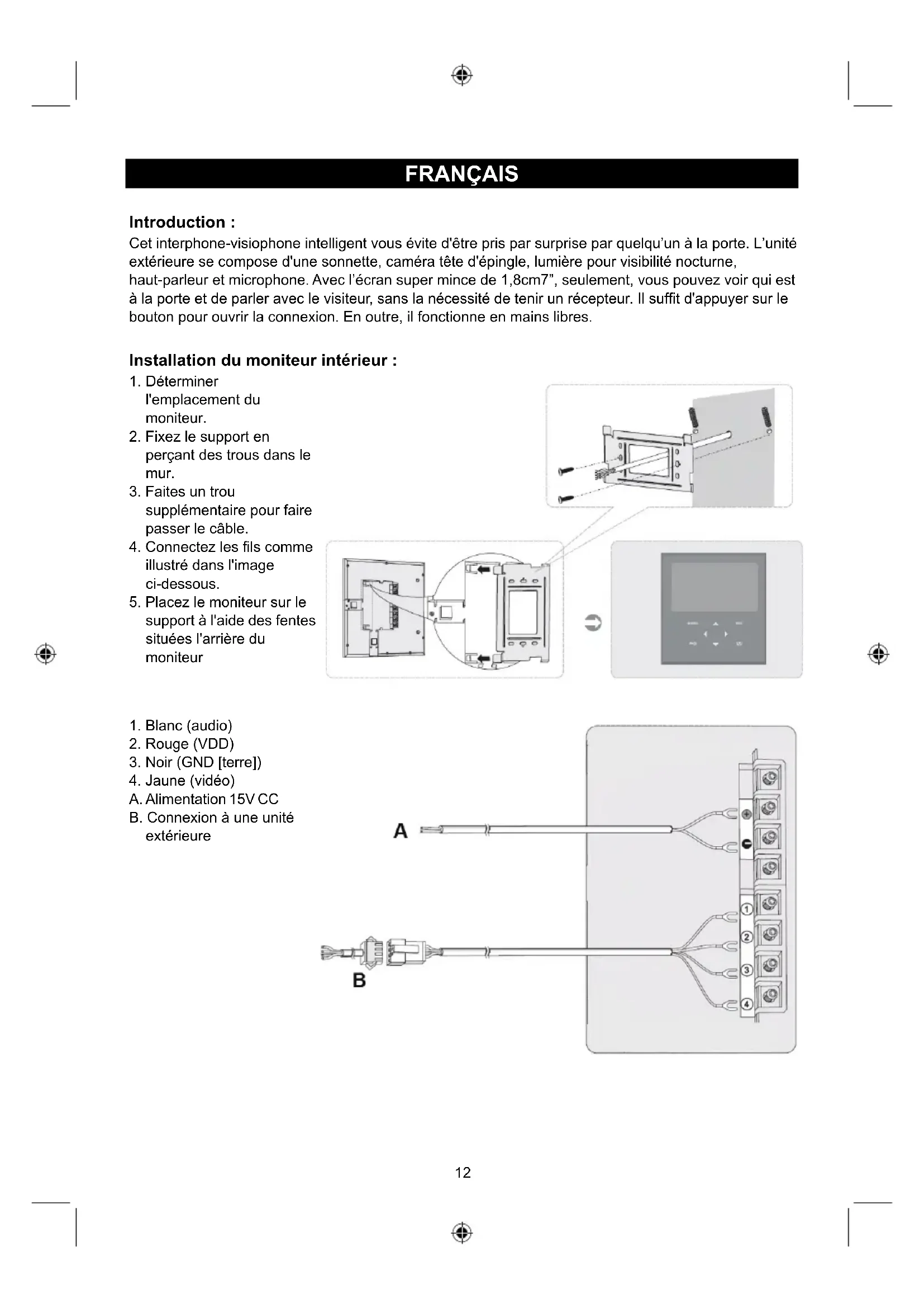A. Alimentation 15V CC B. Connexion à une unité extérieure13 Installation de l’unité extérieure :