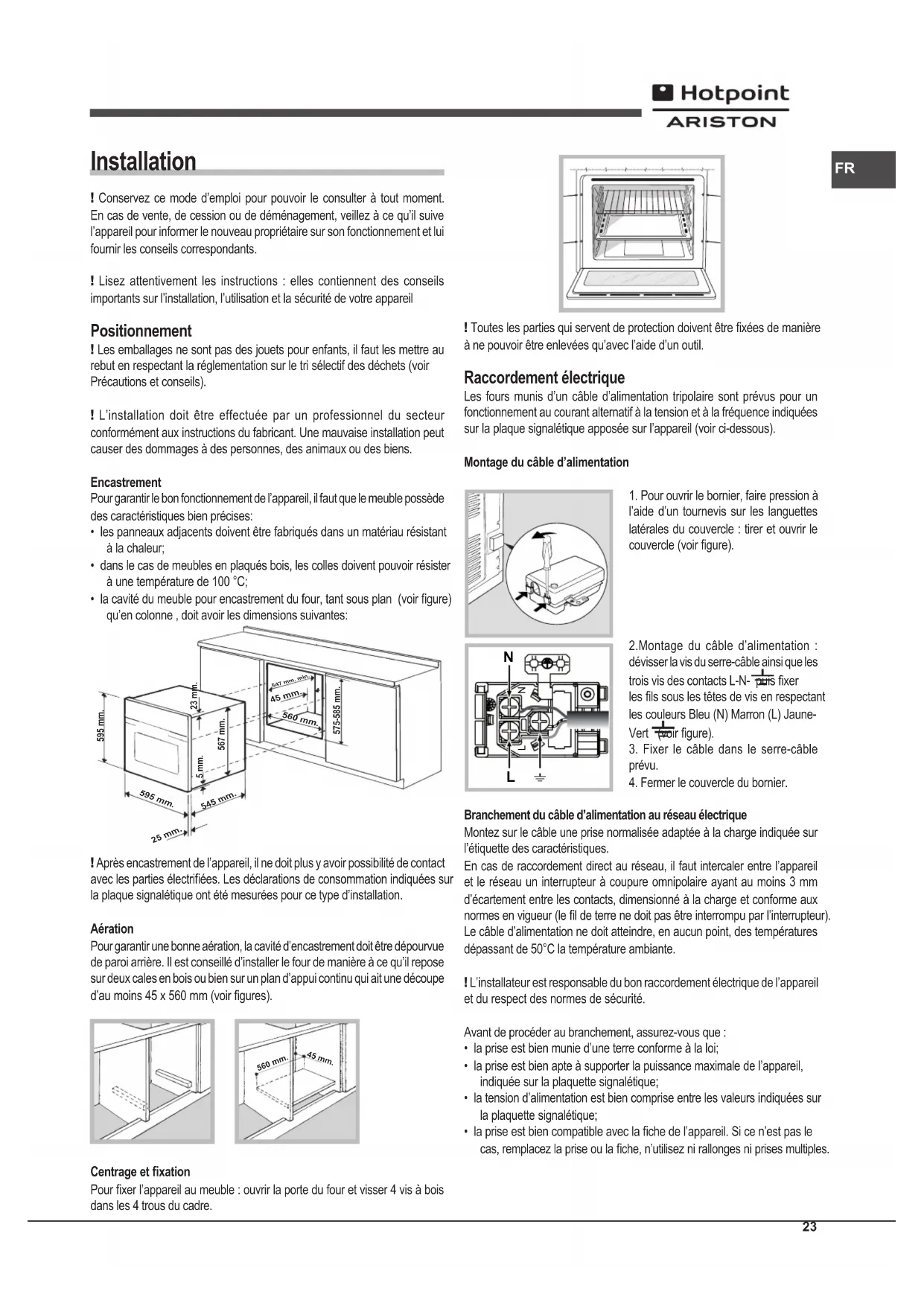 - la cavité du meuble pour encastrement du four, tant sous plan (voir gure) qu’en colonne , doit avoir les dimensions suivantes: 595 mm.595 mm.25 mm.545 mm.5 mm.567 mm.23 mm.575-585 mm.45 mm.560 mm. 547 mm. min. ! Après encastrement de l’appareil, il ne doit plus y avoir possibilité de contact avec les parties électriées. Les déclarations de consommation indiquées sur la plaque signalétique ont été mesurées pour ce type d’installation. Aération Pour garantir une bonne aération, la cavité d’encastrement doit être dépourvue de paroi arrière. Il est conseillé d’installer le four de manière à ce qu’il repose sur deux cales en bois ou bien sur un plan d’appui continu qui ait une découpe d’au moins 45 x 560 mm (voir gures). 560 mm. 45 mm. Centrage et xation Pour xer l’appareil au meuble : ouvrir la porte du four et visser 4 vis à bois dans les 4 trous du cadre. ! Toutes les parties qui servent de protection doivent être xées de manière à ne pouvoir être enlevées qu’avec l’aide d’un outil. Raccordement électrique Les fours munis d’un câble d’alimentation tripolaire sont prévus pour un fonctionnement au courant alternatif à la tension et à la fréquence indiquées sur la plaque signalétique apposée sur l’appareil (voir ci-dessous). Montage du câble d’alimentation