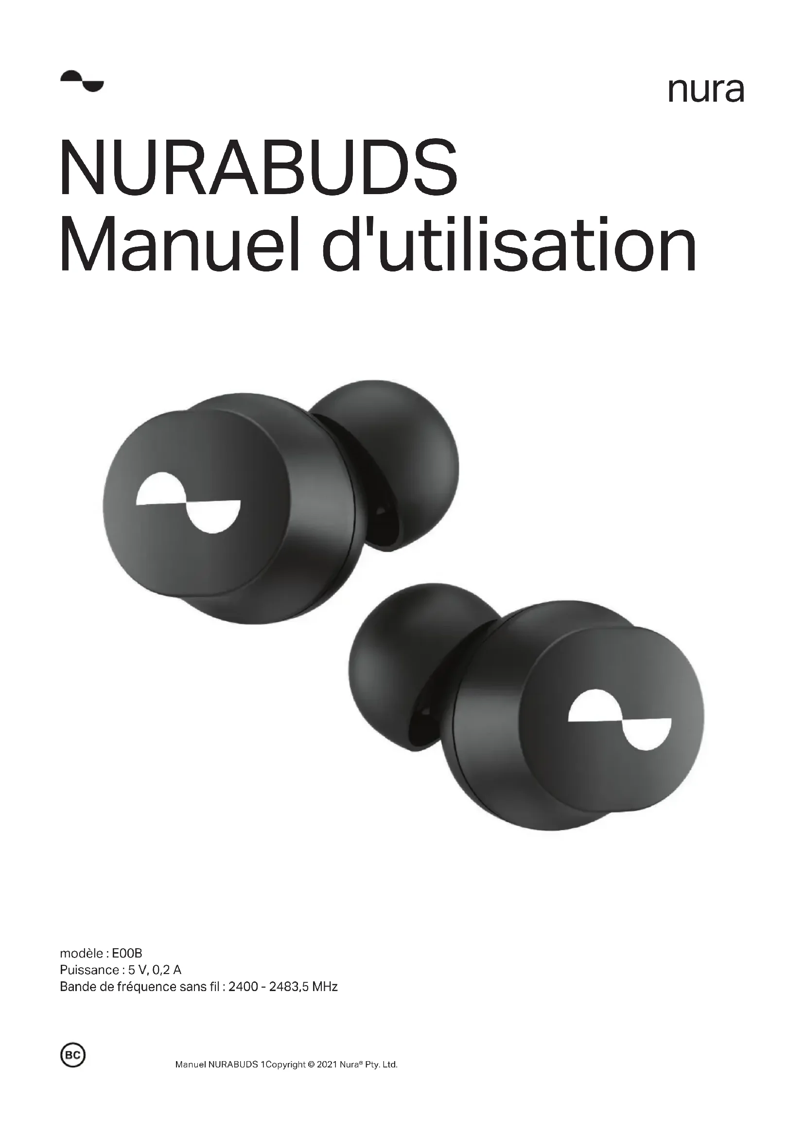 Manuel NURABUDS 1Copyright © 2021 Nura® Pty. Ltd. nura NURABUDS Manuel d'utilisation modèle : E00B Puissance : 5 V, 0,2 A Bande de fréquence sans l : 2400 - 2483,5 MHzManuel NURABUDS 2Copyright © 2021 Nura® Pty. Ltd. nura Table des matières Informations de sécurité NURABUDS 3 Pour commencer 5 Contenu de la boîte 5 Installation de vos NURABUDS 6 Allumer/éteindre vos NURABUDS 6 Téléchargement de l'application Nura 6 Connexion de vos NURABUDS avec Bluetooth® 7 Permutation entre les appareils Bluetooth® 7 Mise à jour de vos NURABUDS 7 Vos NURABUDS 8 Charger vos NURABUDS et l'étui 8 Vérication de la batterie NURABUDS 8 Utilisation des boutons tactiles de vos NURABUDS 8 Passer et recevoir des appels vocaux avec vos NURABUDS 9 Connexion de vos NURABUDS à d'autres produits 9 Ordinateurs 9 Téléviseurs 9 Changement des embouts auriculaires NURABUDS 10 Nettoyer vos NURABUDS 10 Application Nura 11 Fonctionnalités de l'application Nura 11 Personnalisation de vos NURABUDS 12 Comment choisir le niveau d'immersion 12 Comment régler la réduction active du bruit (ANC) ou le mode social 12 Comment modier la langue de la voix NURABUDS 13 Dépannage 14 Réinitialiser vos NURABUDS 14 Dépannage de la charge 14 Dépannage de l'application Nura 14 Dépannage Bluetooth 15 Dépannage des appels vocaux 15 Dépannage de la qualité sonore 15 Dépannage des boutons tactiles 16 Besoin d’aide ? 16 Garantie 16 Conformité 17Manuel NURABUDS 3Copyright © 2021 Nura® Pty. Ltd. nura Informations de sécurité NURABUDS Lisez ce manuel avant d'utiliser vos NURABUDS pour la première fois. Conservez ce manuel à portée de main pour référence future. Les NURABUDS ont été conçus et testés pour la sécurité et le confort, mais veuillez noter que l'exposition à un bruit de 85 décibels (dB) ou plus (environ le même volume qu'un mixeur) peut entraîner une perte auditive progressive. En raison de la clarté et de la réduction du bruit des NURABUDS, vous n'aurez pas besoin d'écouter votre musique aussi fort qu'avec de nombreux écouteurs conventionnels. Surveillez votre utilisation. La perte d'audition est fonction de l'intensité sonore et de la durée d'écoute : plus le volume sonore est élevé, moins de temps vous pouvez écouter. Plus le volume est bas, plus longtemps vous pouvez écouter. Par exemple, 8 heures à 85 dB causent autant de dégâts que 4 heures à 88 dB, 2 heures à 91 dB ou seulement 15 minutes à 100 dB. N'utilisez les NURABUDS que si le volume est réglé à un niveau confortable et modéré. N'écoutez pas de musique à un volume élevé pendant une période prolongée. Sachez que les rappels ou les sons d'avertissement, c'est-à-dire les alarmes, les tonalités de message et les appels entrants, peuvent varier lors de l'utilisation des NURABUDS. Si vous ressentez une sensation de chaleur ou une perte d'audition, retirez immédiatement vos NURABUDS de votre tête et contactez le service d'assistance Nura. Si vos NURABUDS émettent un bruit fort ou inhabituel, arrêtez de les utiliser et contactez immédiatement le service d'assistance Nura. En raison de la technologie de réduction du bruit, n'utilisez jamais vos NURABUDS lorsqu'une incapacité à entendre peut présenter un danger pour vous-même ou pour les autres. Par exemple, au volant, à vélo, sur un chantier de construction, dans ou à proximité de la circulation. Si vous utilisez vos NURABUDS pour des appels téléphoniques en conduisant, soyez prudent et suivez les lois applicables concernant l'utilisation des téléphones portables et des écouteurs. Certaines juridictions imposent des limitations spéciques telles que l'utilisation d'un seul écouteur pendant la conduite. Utilisez uniquement des câbles Nura certiés pour charger vos NURABUDS. Le chargement de vos NURABUDS doit être eectué uniquement en suivant les instructions de ce manuel d'utilisation. N'apportez aucune modication non autorisée à ce produit. Toute tentative de le faire annulera la garantie. ATTENTION, la batterie ne doit pas être exposée à une chaleur excessive telle que le soleil ou autre. ÉLIMINEZ LES BATTERIES USAGÉES CONFORMÉMENT AUX INSTRUCTIONS L'élimination d'une batterie dans le feu ou un four chaud, ou l'écrasement ou la coupe mécanique d'une batterie peut provoquer une explosion. Laisser une batterie dans un environnement à température extrêmement élevée peut entraîner une explosion ou une fuite de liquide ou de gaz inammable.Manuel NURABUDS 4Copyright © 2021 Nura® Pty. Ltd. nura Une batterie soumise à une pression d'air extrêmement basse peut provoquer une explosion ou une fuite de liquide ou de gaz inammable. Contient de petites pièces pouvant présenter un risque d'étouement. Ne convient pas aux enfants de moins de 3 ans. Ce produit contient des composants magnétiques. Consultez votre médecin pour savoir si cela pourrait aecter votre implant médical, le cas échéant. Le retrait de la batterie lithium-ion rechargeable de ce produit doit être eectué uniquement par un professionnel qualié.Manuel NURABUDS 5Copyright © 2021 Nura® Pty. Ltd. nura Pour commencer Étui de charge