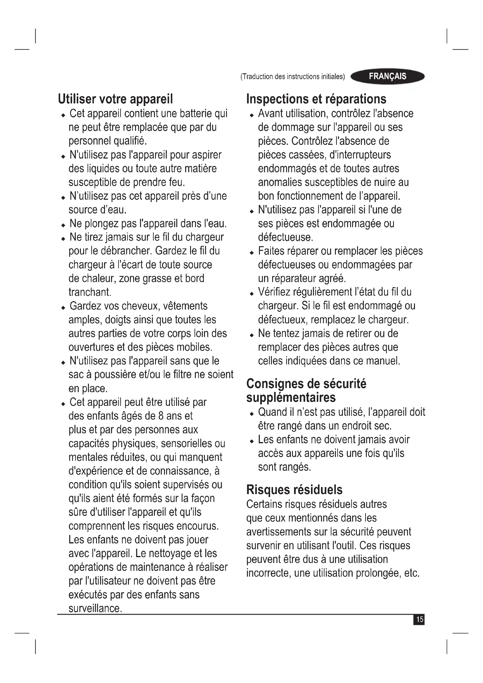 Avertissement ! Veillez à lire tous les avertissements sur la sécurité et toutes les instruc- tions. Le non-respect des aver- tissements et des instructions listés ci-dessous peut occasion- ner des décharges électriques, des incendies et/ou de graves blessures. Avertissement ! Pour utiliser des appareils alimentés par batterie, certaines mesures de sécurité de base, dont celles qui suivent, doivent toujours être respectées an de réduire le risque d'incendie, de fuite de la batterie, de blessures et de dommages matériels. u Veillez à attentivement lire l'inté gralité de c e manuel avant d’utiliser l’appareil. u Ce manuel décrit la manière d'utiliser l'appareil. L'utilisation d'un accessoire ou d'un équipement autre que ceux recommandés dans ce manuel et l'utilisation de cet appareil à d'autres ns que celles recommandées dans ce manuel d'utilisation peuvent entraîner un risque de blessures. u Conservez ce manuel pour pouvoir vous y référer dans le futur.15 (Traduction des instructions initiales) FRANÇAIS Utiliser votre appareil u Cet appareil contient une batterie qui ne peut être remplacée que par du personnel qualié. u N'utilisez pas l'appareil pour aspirer des liquides ou toute autre matière susceptible de prendre feu. u N’utilisez pas cet appareil près d’une source d’eau. u Ne plongez pas l'appareil dans l'eau. u Ne tirez jamais sur le l du chargeur pour le débrancher. Gardez le l du chargeur à l'écart de toute source de chaleur, zone grasse et bord tranchant. u Gardez vos cheveux, vêtements amples, doigts ainsi que toutes les autres parties de votre corps loin des ouvertures et des pièces mobiles. u N'utilisez pas l'appareil sans que le sac à poussière et/ou le ltre ne soient en place. u Cet appareil peut être utilisé par des enfants âgés de 8 ans et plus et par des personnes aux capacités physiques, sensorielles ou mentales réduites, ou qui manquent d'expérience et de connaissance, à condition qu'ils soient supervisés ou qu'ils aient été formés sur la façon sûre d'utiliser l'appareil et qu'ils comprennent les risques encourus. Les enfants ne doivent pas jouer avec l'appareil. Le nettoyage et les opérations de maintenance à réaliser par l'utilisateur ne doivent pas être exécutés par des enfants sans surveillance. Inspections et réparations u Avant utilisation, contrôlez l'absence de dommage sur l'appareil ou ses pièces. Contrôlez l'absence de pièces cassées, d'interrupteurs endommagés et de toutes autres anomalies susceptibles de nuire au bon fonctionnement de l’appareil. u N'utilisez pas l'appareil si l'une de ses pièces est endommagée ou défectueuse. u Faites réparer ou remplacer les pièces défectueuses ou endommagées par un réparateur agréé. u Vériez régulièrement l’état du l du chargeur. Si le l est endommagé ou défectueux, remplacez le chargeur. u Ne tentez jamais de retirer ou de remplacer des pièces autres que celles indiquées dans ce manuel. Consignes de sécurité supplémentaires u Quand il n’est pas utilisé, l’appareil doit être rangé dans un endroit sec. u Les enfants ne doivent jamais avoir accès aux appareils une fois qu'ils sont rangés. Risques résiduels Certains risques résiduels autres que ceux mentionnés dans les avertissements sur la sécurité peuvent survenir en utilisant l'outil. Ces risques peuvent être dus à une utilisation incorrecte, une utilisation prolongée, etc.16 (Traduction des instructions initiales) FRANÇAIS Malgré le respect de toutes les réglementations pertinentes sur la sécurité et la mise en œuvre de dispositifs de sécurité, certains risques résiduels ne peuvent pas être évités. Ils comprennent : u Les blessures dues au contact avec des pièces mobiles. u Les blessures dues au contact avec des pièces brûlantes. u Les blessures dues au changement de pièces ou d'accessoires. u Les blessures dues à l'utilisation prolongée de l'appareil. Lorsque vous utilisez un appareil quel qu'il soit pendant de longues périodes, veillez à faire des pauses régulières. u Les risques pour la santé dus à l'inhalation des poussières émises pendant l'utilisation de l'outil (exemple : travail avec du bois, surtout le chêne, le hêtre et les panneaux en MDF). Batteries et chargeurs Batteries u Ne tentez de les ouvrir sous aucun prétexte. u N'exposez pas la batterie à l'eau. u N'exposez pas la batterie à la chaleur. u Ne la rangez pas dans des endroits où la température peut dépasser 40°C. u Ne procédez à la charge qu'à une température ambiante comprise entre 10°C et 40°C. u Ne procédez à la charge qu'avec le chargeur fourni avec l’appareil/outil. L'utilisation d'un chargeur inadapté peut occasionner une décharge électrique ou la surchauffe de la batterie. u Pour la mise au rebut des batteries, respectez les instructions mentionnées à la section "Protection de l'environnement". u Ne déformez/n’endommagez pas le bloc-batterie en le perçant ou en le cognant, ceci pourrait entraîner des blessures et un incendie. u Ne rechargez pas des batteries endommagées. u Dans des conditions extrêmes, une batterie peut fuir. Si vous détectez une fuite, utilisez un chiffon pour essuyer le liquide avec précaution. Évitez tout contact avec la peau. u En cas de contact avec la peau ou les yeux, suivez les instructions ci- dessous. Avertissement ! Le liquide de la batterie peut provoquer des blessures ou des dégâts matériels. En cas de contact avec la peau, rincez immédiatement à l'eau. Si des rougeurs, une douleur ou une irritation se produisent, consultez un médecin. En cas de contact avec les yeux, rincez immédiatement à l'eau et consultez un médecin. Chargeurs Votre chargeur a été conçu pour une tension spécique.17 (Traduction des instructions initiales) FRANÇAIS Vériez toujours que la tension du réseau électrique correspond à celle de la plaque signalétique et des informations du tableau de données tech