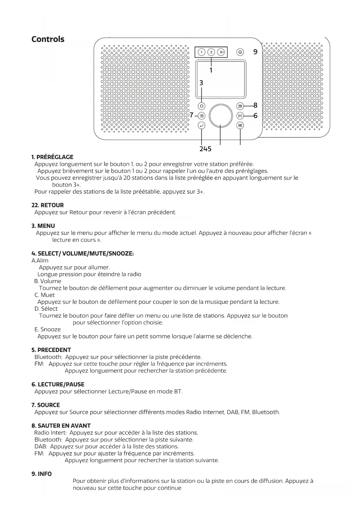 A. Alim Appuyez sur pour allumer. Longue pression pour éteindre la radio B. Volume Tournez le bouton de défilement pour augmenter ou diminuer le volume pendant la lecture. C. Muet Appuyez sur le bouton de défilement pour couper le son de la musique pendant la lecture. D. Sélect Tournez le bouton pour faire défiler un menu ou une liste de stations. Appuyez sur le bouton pour sélectionner l’option choisie. E. Snooze Appuyez sur le bouton pour faire un petit somme lorsque l’alarme se déclenche.