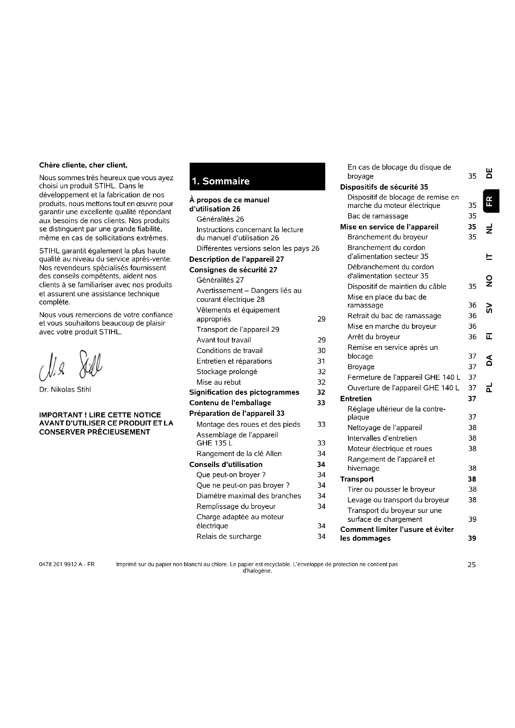 DENLITNOSVFIDAPL FR 0478 201 9912 A - FR Chère cliente, cher client, Nous sommes très heureux que vous ayez choisi un produit STIHL. Dans le développement et la fabrication de nos produits, nous mettons tout en œuvre pour garantir une excellente qualité répondant aux besoins de nos clients. Nos produits se distinguent par une grande fiabilité, même en cas de sollicitations extrêmes. STIHL garantit également la plus haute qualité au niveau du service après-vente. Nos revendeurs spécialisés fournissent des conseils compétents, aident nos clients à se familiariser avec nos produits et assurent une assistance technique complète. Nous vous remercions de votre confiance et vous souhaitons beaucoup de plaisir avec votre produit STIHL. Dr. Nikolas Stihl