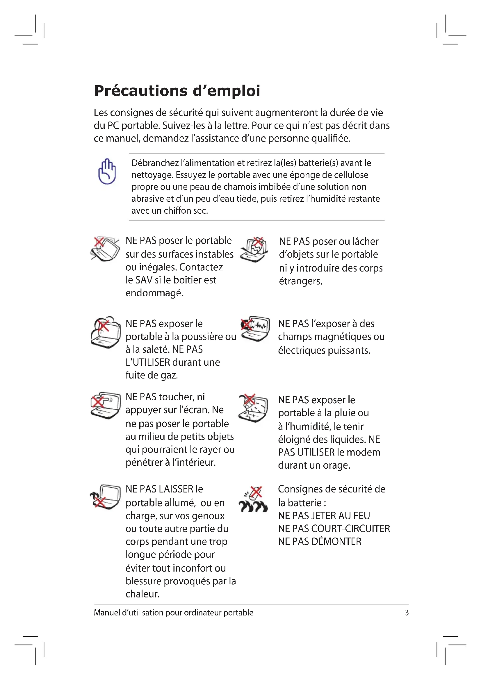 Précautions d’emploi Les consignes de sécurité qui suivent augmenteront la durée de vie du PC portable. Suivez-les à la lettre. Pour ce qui n’est pas décrit dans ce manuel, demandez l’assistance d’une personne qualifiée. Consignes de sécurité de la batterie :