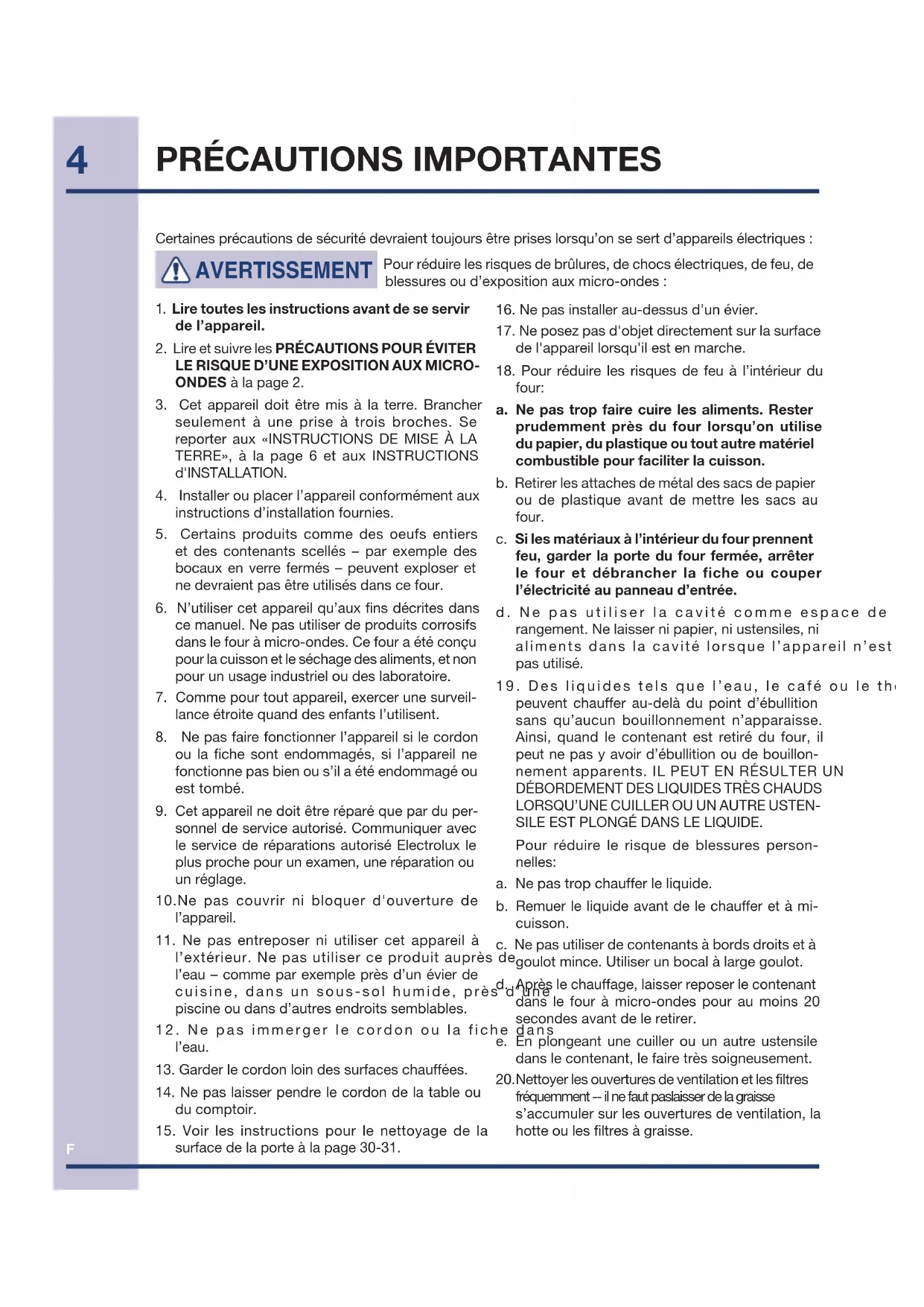 peuvent chauffer au-delà du point d’ébullition sans qu’aucun bouillonnement n’apparaisse. Ainsi, quand le contenant est retiré du four, il peut ne pas y avoir d’ébullition ou de bouillon- nement apparents. IL PEUT EN RÉSULTER UN DÉBORDEMENT DES LIQUIDES TRÈS CHAUDS LORSQU’UNE CUILLER OU UN AUTRE USTEN- SILE EST PLONGÉ DANS LE LIQUIDE. Pour réduire le risque de blessures person- nelles: a. Ne pas trop chauffer le liquide. b. Remuer le liquide avant de le chauffer et à mi- cuisson. c. Ne pas utiliser de contenants à bords droits et à goulot mince. Utiliser un bocal à large goulot. d. Après le chauffage, laisser reposer le contenant dans le four à micro-ondes pour au moins 20 secondes avant de le retirer. e. En plongeant une cuiller ou un autre ustensile dans le contenant, le faire très soigneusement.