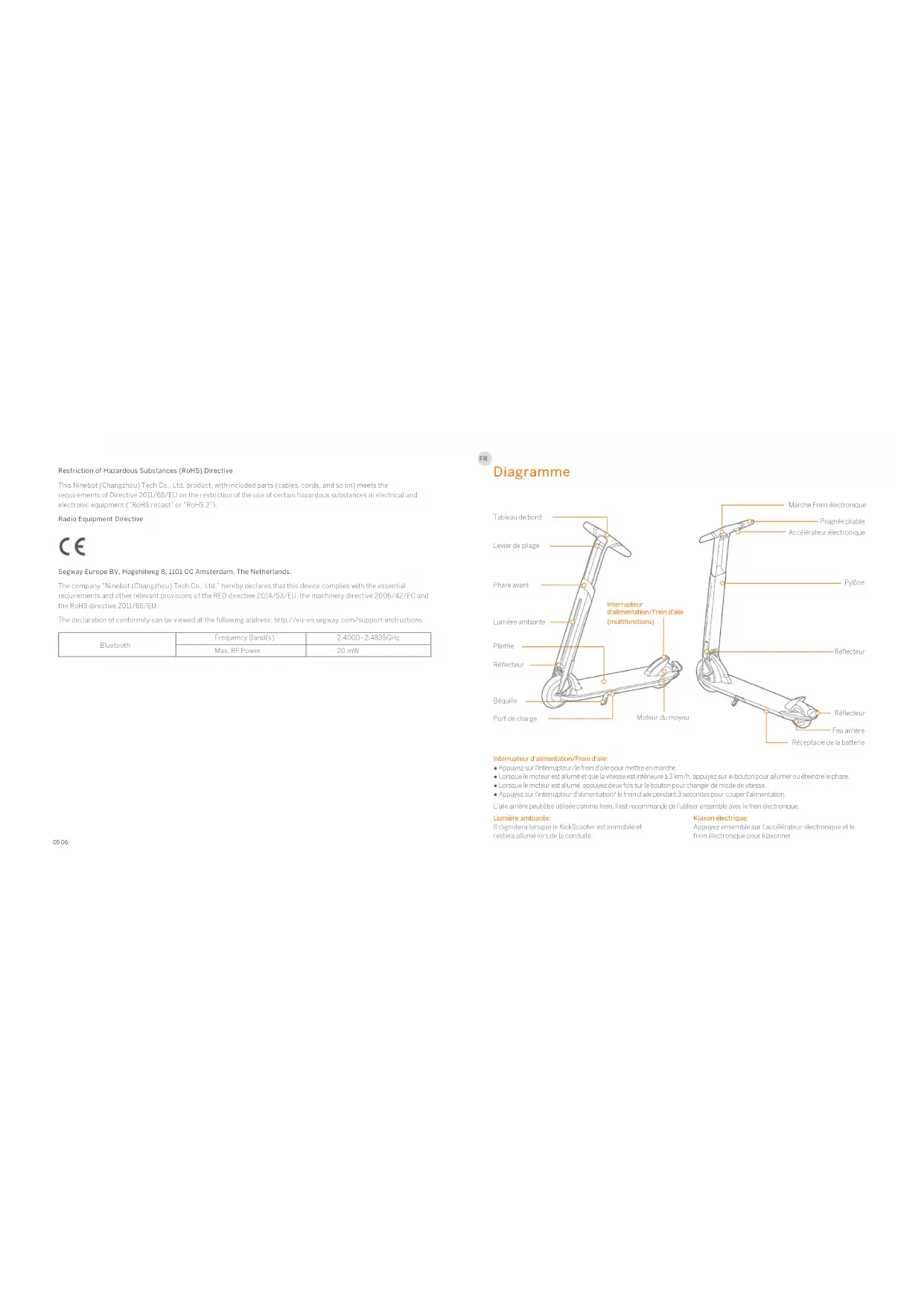 Certains facteurs peuvent affecter l'autonomie comme : la vitesse, le nombre de démarrages et d'arrêts, la température ambiante, etc. Produit Modèle Poids net Nom Ninebot KickScooter Air T15E Env. 23.2 lbs (10.5 kg) Température d'opération Température d'entreposage Indice IP Durée de chargement Max. Tension de charge Température de charge Tension nominale 14–104°F (-10–40°C) 14–122°F (-10–50°C) IPX4 Env. 4 h 36 V 42 V 32–104°F (0–40°C) Article Paramètre1009 Certifications Déclaration de conformité Union européenne Informations importantes sur les DEEE Informations sur l'élimination et le recyclage des DEEE Elimination correcte de ce produit. Ce marquage indique que ce produit ne doit pas être éliminé avec d'autres déchets ménagers dans l'ensemble de l'UE. Pour éviter tout risque d'atteinte à l'environnement ou à la santé humaine dû à une élimination incontrôlée des déchets, recyclez-le afin de promouvoir la réutilisation durable des ressources en matériaux. Pour retourner votre appareil usagé, veuillez utiliser les systèmes de retour et de collecte ou contacter le détaillant où l'appareil a été acheté.. Ils peuvent prendre ce produit pour un recyclage sans danger pour l'environnement. Information de recyclage de la batterie pour l'Union européenne Emballage de piles ou batteries sont étiquetés conformément à la directive 2006/66/CE et l’amendement 2013/56/UE relatif aux piles et accumulateurs ainsi qu'aux déchets de piles et d'accumulateurs. La Directive établit un cadre pour la collecte et le recyclage des batteries et piles usagées applicable dans l'ensemble de l'Union européenne. Cet étiquetage est appliqué à diverses batteries pour indiquer que la batterie ne doit pas être jetée mais récupérée en fin de vie conformément à cette Directive. Conformément à la Directive européenne 2006/66/CE et l’amendement 2013/56/UE, les batteries et piles sont étiquetées de manière à indiquer qu'elles doivent être recueillies séparément et recyclées en fin de vie. L'étiquetage de la batterie peut également inclure le symbole chimique du métal contenu dans la batterie (Pb pour le plomb, Hg pour le mercure et Cd pour le cadmium). Les utilisateurs de batteries et piles ne doivent pas les jeter comme déchets ménagers non triés, mais utiliser les infrastructures mises à disposition des consommateurs en vue de leur collecte, recyclage et traitement. La participation des consommateurs est importante afin minimiser les effets potentiels des batteries et piles sur l'environnement et la santé en raison de la présence de substances dangereuses. Avant de placer des équipements électriques et électroniques (EEE) dans le flux de collecte des déchets ou dans des installations de collecte des déchets, l'utilisateur final des équipements contenant des piles et / ou des accumulateurs doit retirer ces piles et ces accumulateurs pour une collecte séparée. Directive relative à la limitation des substances dangereuses (RoHS) Ce produit Ninebot (Changzhou) Tech Co., Ltd., avec les pièces incluses (câbles, cordons, etc.) est conforme aux exigences de la directive 2011/65/UE relative à la limitation de l'utilisation de certaines substances dangereuses dans les équipements électriques et électroniques ("Refonte RoHS" ou "RoHS 2"). Directive sur l'équipement radio Segway Europe B.V. Adresse de contact UE pour les questions réglementaires uniquement: Hogehilweg 8, 1101CC Amsterdam, Pays-Bas. Par la présente, la société « Ninebot (Changzhou) Tech Co., Ltd. » déclare que cet appareil est conforme aux exigences essentielles et autres dispositions pertinentes de la directive RED 2014/53/EU, de la directive machine 2006/42/CE et de la directive RoHS 2011/65/EU. La déclaration de conformité peut être consultée en langue originale à l'adresse suivante : http://eu-en.segway.com/support-instructions Bluetooth Max. Puissance RF Bandes de fréquence (s) 20 mW 2.4000–2.4835GHz1211