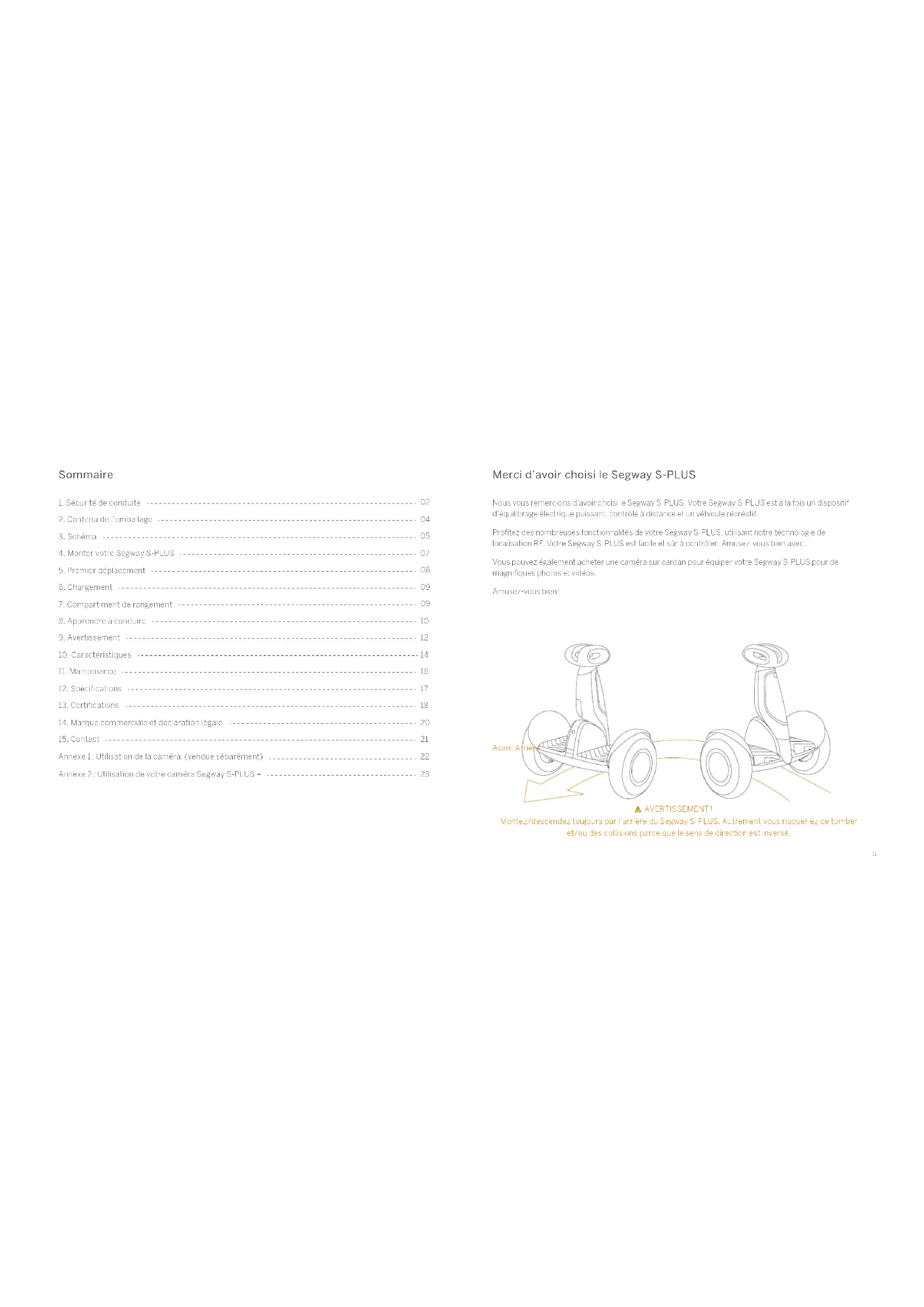 Avant Arrière AVERTISSEMENT! Montez/descendez toujours par l’arrière du Segway S-PLUS. Autrement vous risqueriez de tomber et/ou des collisions parce que le sens de direction est inversé.02 03 1 Sécurité de conduite 1. Le Segway S-PLUS est un produit récréatif. Avant de maîtriser vos capacités de déplacement, vous devez vous entraîner. Ni Ninebot Inc. ni Segway Inc. ne sont responsables de toute blessure ou dommage engendré par l’inexpérience de l’utilisateur ou son non respect des instructions de ce document.