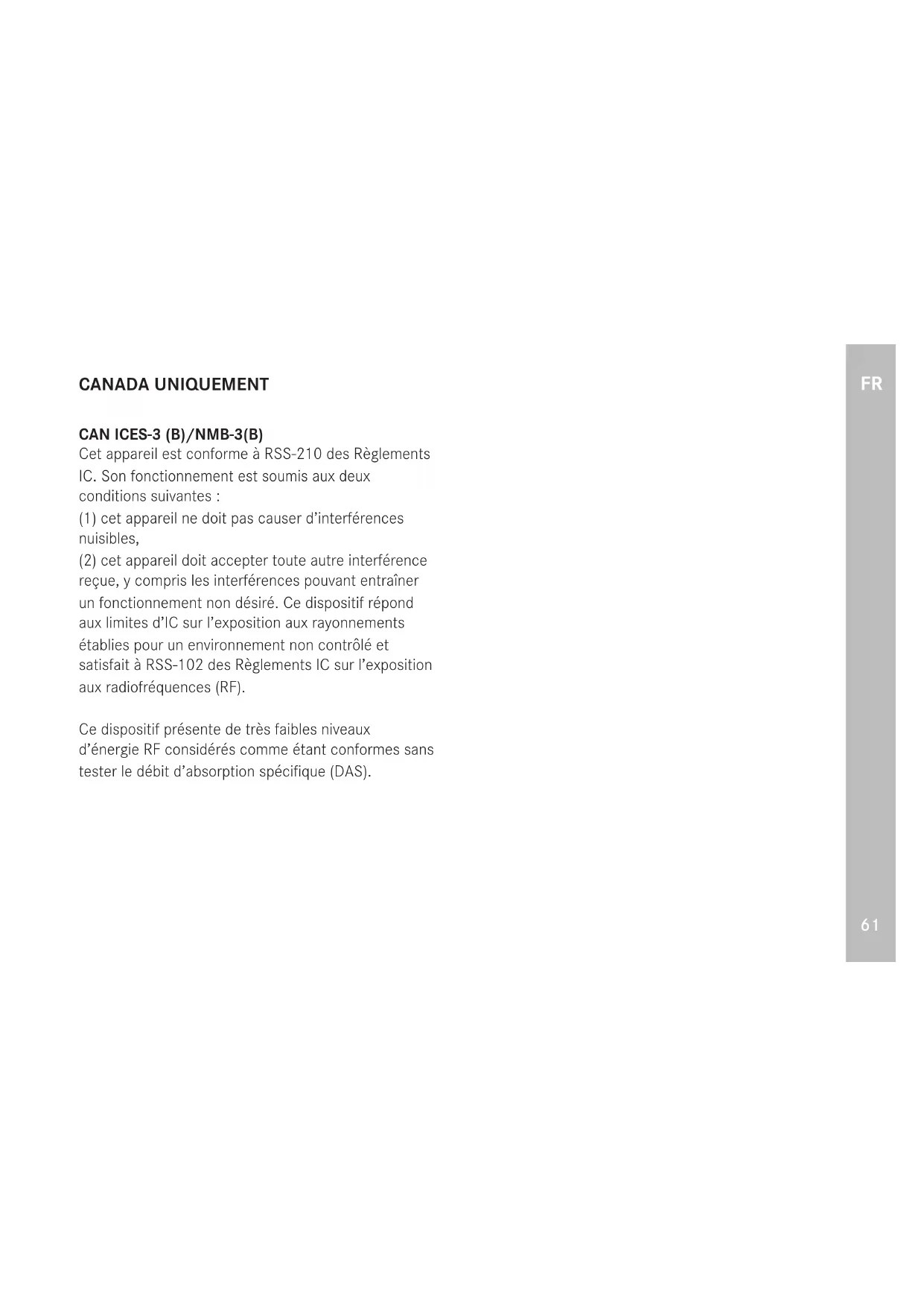 CANADA UNIQUEMENT CAN ICES-3 (B)/NMB-3(B) Cet appareil est conforme à RSS-210 des Règlements IC. Son fonctionnement est soumis aux deux conditions suivantes : (1) cet appareil ne doit pas causer d’interférences nuisibles, (2) cet appareil doit accepter toute autre interférence reçue, y compris les interférences pouvant entraîner un fonctionnement non désiré. Ce dispositif répond aux limites d’IC sur l’exposition aux rayonnements établies pour un environnement non contrôlé et satisfait à RSS-102 des Règlements IC sur l’exposition aux radiofréquences (RF). Ce dispositif présente de très faibles niveaux d’énergie RF considérés comme étant conformes sans tester le débit d’absorption spécifique (DAS).FR