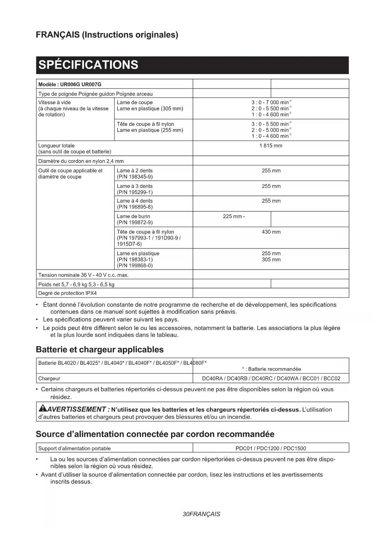Longueur totale (sans outil de coupe et batterie) 1 815 mm Diamètre du cordon en nylon 2,4 mm Outil de coupe applicable et diamètre de coupe Lame à 2 dents (P/N 198345-9) 255 mm Lame à 3 dents (P/N 195299-1) 255 mm Lame à 4 dents (P/N 196895-8) 255 mm Lame de burin (P/N 199872-9) 225 mm - Têtedecoupeàlnylon (P/N 197993-1 / 191D90-9 / 1915D7-6) 430 mm Lame en plastique (P/N 198383-1) (P/N 199868-0) 255 mm 305 mm Tension nominale 36 V - 40 V c.c. max. Poids net 5,7 - 6,9 kg 5,3 - 6,5 kg Degré de protection IPX4