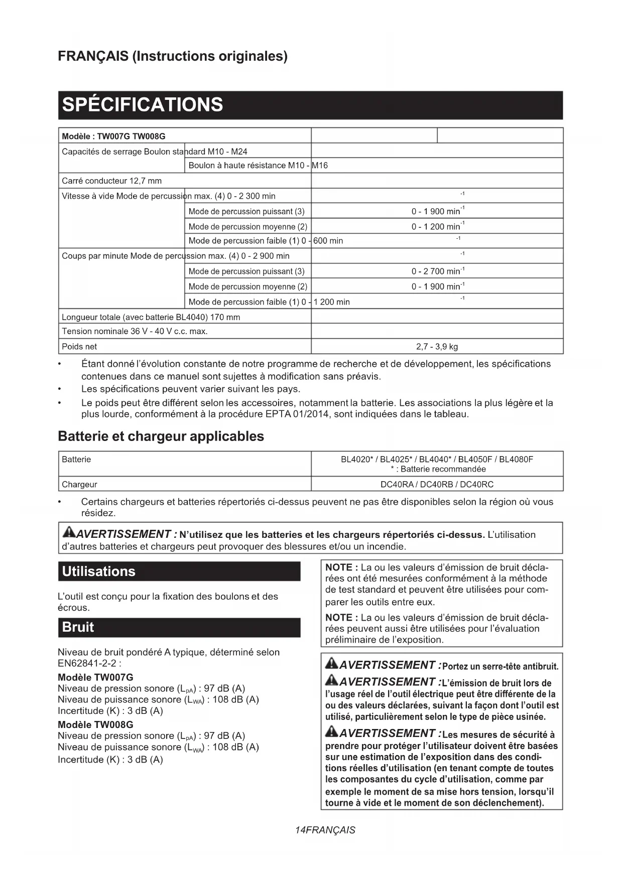 d’autres batteries et chargeurs peut provoquer des blessures et/ou un incendie. Utilisations L’outilestconçupourlaxationdesboulonsetdes écrous. Bruit Niveau de bruit pondéré A typique, déterminé selon EN62841-2-2 : Modèle TW007G Niveau de pression sonore (L