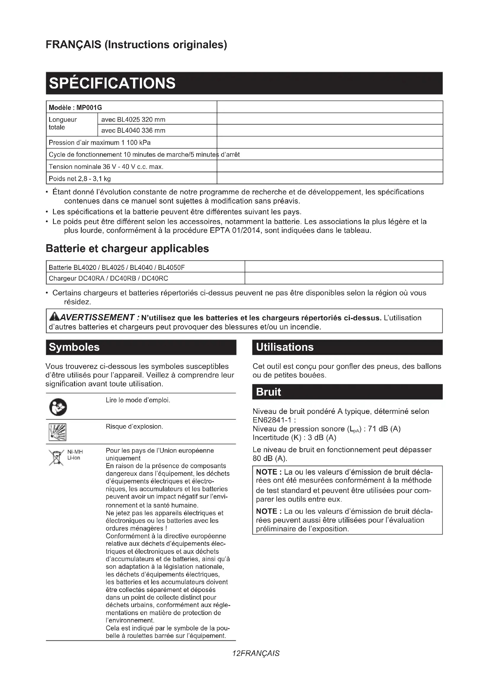 d’autres batteries et chargeurs peut provoquer des blessures et/ou un incendie. Symboles Vous trouverez ci-dessous les symboles susceptibles d’être utilisés pour l’appareil. Veillez à comprendre leur signication avant toute utilisation. Lire le mode d’emploi. Risque d’explosion. Ni-MH Li-ion Pour les pays de l’Union européenne uniquement En raison de la présence de composants dangereux dans l’équipement, les déchets d’équipements électriques et électro- niques, les accumulateurs et les batteries peuvent avoir un impact négatif sur l’envi- ronnement et la santé humaine. Ne jetez pas les appareils électriques et électroniques ou les batteries avec les ordures ménagères ! Conformément à la directive européenne relative aux déchets d’équipements élec- triques et électroniques et aux déchets d’accumulateurs et de batteries, ainsi qu’à son adaptation à la législation nationale, les déchets d’équipements électriques, les batteries et les accumulateurs doivent être collectés séparément et déposés dans un point de collecte distinct pour déchets urbains, conformément aux régle- mentations en matière de protection de l’environnement. Cela est indiqué par le symbole de la pou- belle à roulettes barrée sur l’équipement. Utilisations Cet outil est conçu pour goner des pneus, des ballons ou de petites bouées. Bruit Niveau de bruit pondéré A typique, déterminé selon EN62841-1 : Niveau de pression sonore (L