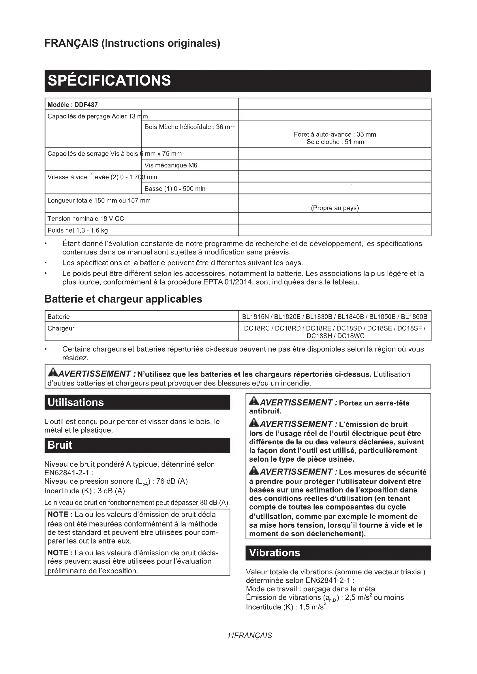 ou moins Incertitude (K) : 1,5 m/s 212 FRANÇAIS NOTE : La ou les valeurs de vibration totales décla- rées ont été mesurées conformément à la méthode de test standard et peuvent être utilisées pour com- parer les outils entre eux. NOTE : La ou les valeurs de vibration totales décla- rées peuvent aussi être utilisées pour l’évaluation préliminaire de l’exposition.