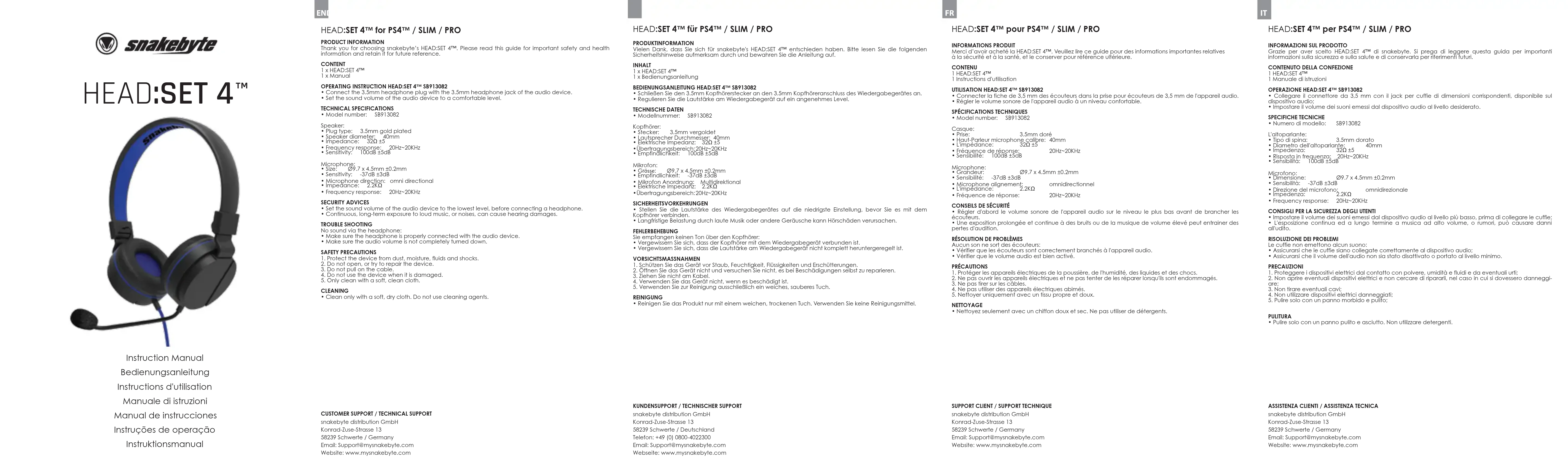 - Reinigen Sie das Produkt nur mit einem weichen, trockenen Tuch. Verwenden Sie keine Reinigungsmittel. HEAD:SET 4™ pour PS4™ / SLIM / PRO INFORMATIONS PRODUIT Merci d’avoir acheté la HEAD:SET 4™. Veuillez lire ce guide pour des informations importantes relatives à la sécurité et à la santé, et le conserver pour référence ultérieure.CONTENU1 HEAD:SET 4™1 Instructions d'utilisation UTILISATION HEAD:SET 4™ SB913082• Connecter la fiche de 3,5 mm des écouteurs dans la prise pour écouteurs de 3,5 mm de l'appareil audio. • Régler le volume sonore de l'appareil audio à un niveau confortable.SPÉCIFICATIONS TECHNIQUES• Model number: SB913082Casque:• Prise: 3.5mm doré• Haut-Parleur microphone calibre: 40mm• L'impédance: 32Ω ±5• Fréquence de réponse: 20Hz~20KHz• Sensibilité: 100dB ±5dBMicrophone:• Grandeur: Ø9.7 x 4.5mm ±0.2mm• Sensibilité: -37dB ±3dB• Microphone alignement: omnidirectionnel• L'impédance: 2.2KΩ• Fréquence de réponse: 20Hz~20KHzCONSEILS DE SÉCURITÉ• Régler d'abord le volume sonore de l'appareil audio sur le niveau le plus bas avant de brancher les écouteurs.• Une exposition prolongée et continue à des bruits ou de la musique de volume élevé peut entrainer des pertes d'audition.RÉSOLUTION DE PROBLÈMESAucun son ne sort des écouteurs:• Vérifier que les écouteurs sont correctement branchés à l'appareil audio. • Vérifier que le volume audio est bien activé.PRÉCAUTIONS 1. Protéger les appareils électriques de la poussière, de l'humidité, des liquides et des chocs.2. Ne pas ouvrir les appareils électriques et ne pas tenter de les réparer lorsqu'ils sont endommagés. 3. Ne pas tirer sur les câbles.4. Ne pas utiliser des appareils électriques abimés.5. Nettoyer uniquement avec un tissu propre et doux.NETTOYAGE• Nettoyez seulement avec un chiffon doux et sec. Ne pas utiliser de détergents. HEAD:SET 4
