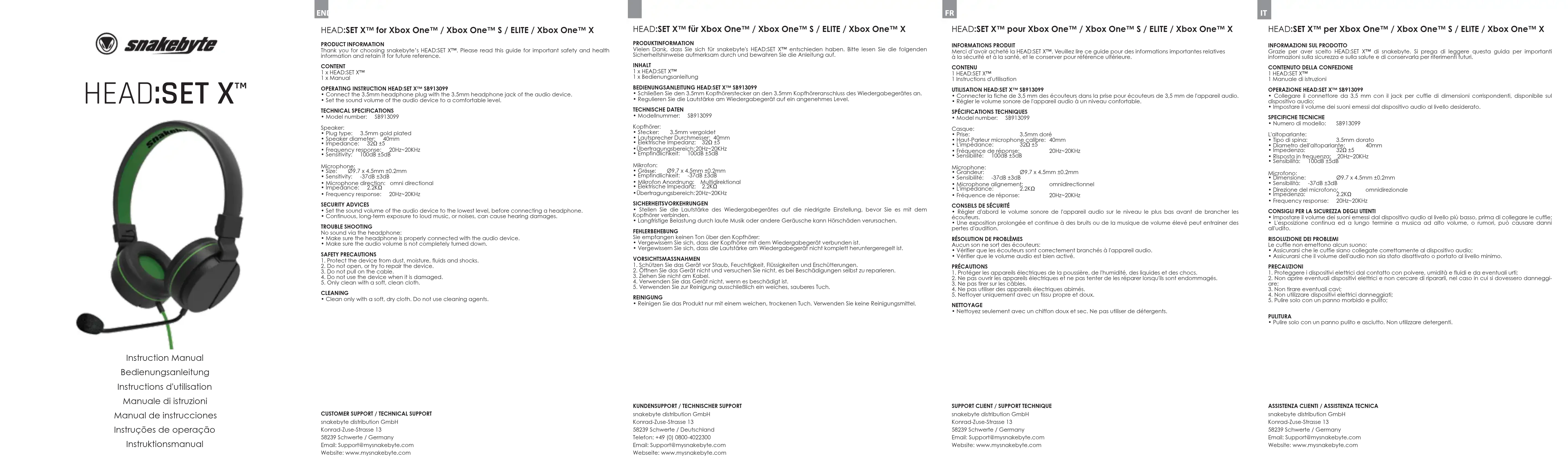 - Reinigen Sie das Produkt nur mit einem weichen, trockenen Tuch. Verwenden Sie keine Reinigungsmittel. HEAD:SET X™ pour Xbox One™ / Xbox One™ S / ELITE / Xbox One™ X INFORMATIONS PRODUIT Merci d’avoir acheté la HEAD:SET X™. Veuillez lire ce guide pour des informations importantes relatives à la sécurité et à la santé, et le conserver pour référence ultérieure.CONTENU1 HEAD:SET X™1 Instructions d'utilisation UTILISATION HEAD:SET X™ SB913099• Connecter la fiche de 3,5 mm des écouteurs dans la prise pour écouteurs de 3,5 mm de l'appareil audio. • Régler le volume sonore de l'appareil audio à un niveau confortable.SPÉCIFICATIONS TECHNIQUES• Model number: SB913099Casque:• Prise: 3.5mm doré• Haut-Parleur microphone calibre: 40mm• L'impédance: 32Ω ±5• Fréquence de réponse: 20Hz~20KHz• Sensibilité: 100dB ±5dBMicrophone:• Grandeur: Ø9.7 x 4.5mm ±0.2mm• Sensibilité: -37dB ±3dB• Microphone alignement: omnidirectionnel• L'impédance: 2.2KΩ• Fréquence de réponse: 20Hz~20KHzCONSEILS DE SÉCURITÉ• Régler d'abord le volume sonore de l'appareil audio sur le niveau le plus bas avant de brancher les écouteurs.• Une exposition prolongée et continue à des bruits ou de la musique de volume élevé peut entrainer des pertes d'audition.RÉSOLUTION DE PROBLÈMESAucun son ne sort des écouteurs:• Vérifier que les écouteurs sont correctement branchés à l'appareil audio. • Vérifier que le volume audio est bien activé.PRÉCAUTIONS 1. Protéger les appareils électriques de la poussière, de l'humidité, des liquides et des chocs.2. Ne pas ouvrir les appareils électriques et ne pas tenter de les réparer lorsqu'ils sont endommagés. 3. Ne pas tirer sur les câbles.4. Ne pas utiliser des appareils électriques abimés.5. Nettoyer uniquement avec un tissu propre et doux.NETTOYAGE• Nettoyez seulement avec un chiffon doux et sec. Ne pas utiliser de détergents.