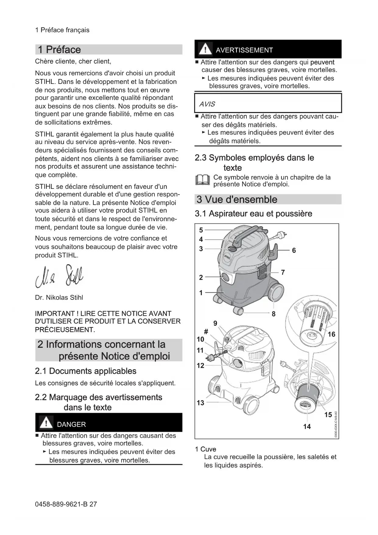 - 19 Information Produit français 17 Spare Parts and Accessories 26 0458-889-9621-B © ANDREAS STIHL AG & Co. KG 2022 0458-889-9621-B. VA0.M21. Imprimé sur papier blanchi sans chlore L'encre d'imprimerie contient des huiles végétales, le papier est recyclable. Traduction de la Notice d'emploi d'origine 0000009016_008_F1 Préface Chère cliente, cher client, Nous vous remercions d'avoir choisi un produit STIHL. Dans le développement et la fabrication de nos produits, nous mettons tout en œuvre pour garantir une excellente qualité répondant aux besoins de nos clients. Nos produits se dis‐ tinguent par une grande fiabilité, même en cas de sollicitations extrêmes. STIHL garantit également la plus haute qualité au niveau du service après-vente. Nos reven‐ deurs spécialisés fournissent des conseils com‐ pétents, aident nos clients à se familiariser avec nos produits et assurent une assistance techni‐ que complète. STIHL se déclare résolument en faveur d'un développement durable et d'une gestion respon‐ sable de la nature. La présente Notice d'emploi vous aidera à utiliser votre produit STIHL en toute sécurité et dans le respect de l'environne‐ ment, pendant toute sa longue durée de vie. Nous vous remercions de votre confiance et vous souhaitons beaucoup de plaisir avec votre produit STIHL. Dr. Nikolas Stihl p. 39