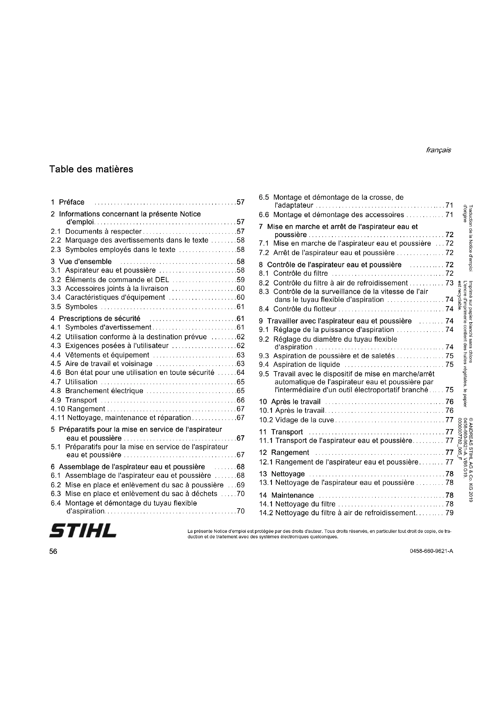 Thomas Elsner, Head of Product Management and Services 19 Disposal 20 EC Declaration of ConformityTraduction de la Notice d'emploi d'origine Imprimé sur papier blanchi sans chlore L'encre d'imprimerie contient des huiles végétales, le papier est recyclable. © ANDREAS STIHL AG & Co. KG 2019 0458-660-9621-A. VB6.G19. 0000007782_005_F 0458-660-9621-A français
