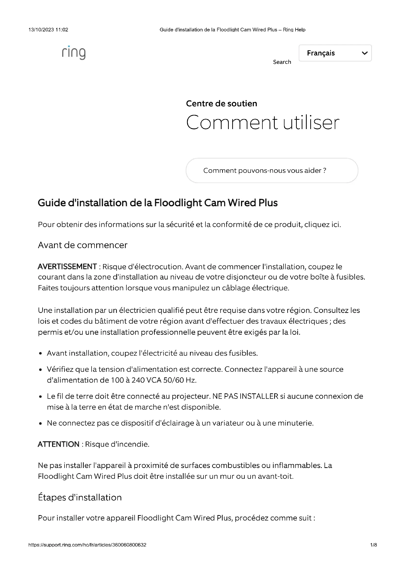 courant dans la zone d'installation au niveau de votre disjoncteur ou de votre boîte à fusibles. Faites toujours attention lorsque vous manipulez un câblage électrique. Une installation par un électricien qualifié peut être requise dans votre région. Consultez les lois et codes du bâtiment de votre région avant d'effectuer des travaux électriques ; des permis et/ou une installation professionnelle peuvent être exigés par la loi. Avant installation, coupez l'électricité au niveau des fusibles. Vérifiez que la tension d'alimentation est correcte. Connectez l'appareil à une source d'alimentation de 100 à 240 VCA 50/60 Hz. Le fil de terre doit être connecté au projecteur. NE PAS INSTALLER si aucune connexion de mise à la terre en état de marche n'est disponible. Ne connectez pas ce dispositif d'éclairage à un variateur ou à une minuterie. ATTENTION : Risque d'incendie. Ne pas installer l'appareil à proximité de surfaces combustibles ou inflammables. La Floodlight Cam Wired Plus doit être installée sur un mur ou un avant-toit. Étapes d'installation Pour installer votre appareil Floodlight Cam Wired Plus, procédez comme suit : Search Français13/10/2023 11:02 Guide d'installation de la Floodlight Cam Wired Plus – Ring Help https://support.ring.com/hc/fr/articles/360060800632 2/8