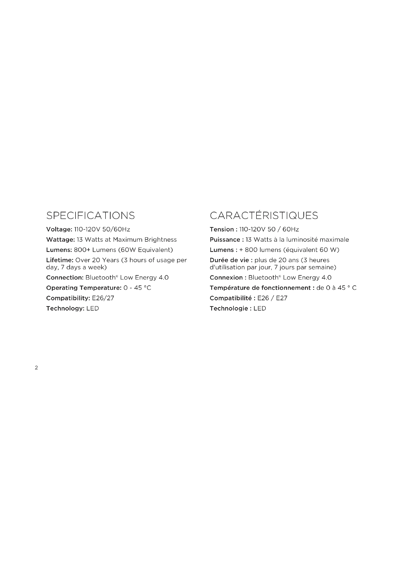 CARACTÉRISTIQUES Tension : 110-120V 50 / 60Hz Puissance : 13 Watts à la luminosité maximale Lumens : + 800 lumens (équivalent 60 W) Durée de vie : plus de 20 ans (3 heures d'utilisation par jour, 7 jours par semaine) Connexion : Bluetooth® Low Energy 4.0 Température de fonctionnement : de 0 à 45 ° C Compatibilité : E26 / E27 Technologie : LED ATTENTION