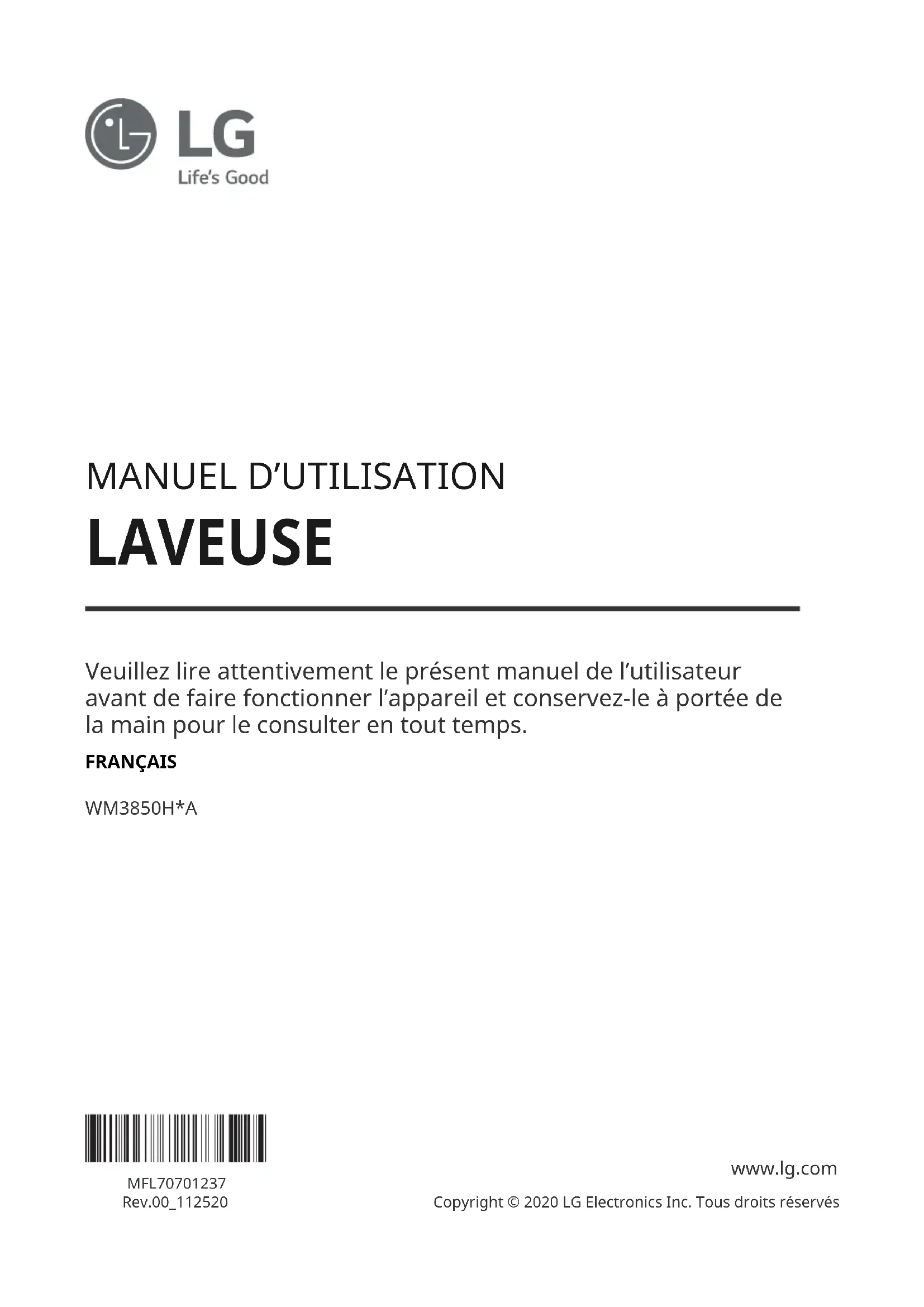 LAVEUSE Veuillez lire attentivement le présent manuel de lʼutilisateur avant de faire fonctionner lʼappareil et conservez-le à portée de la main pour le consulter en tout temps. FRANÇAIS WM3850H*A MFL70701237 Rev.00_112520 www.lg.com Copyright © 2020 LG Electronics Inc. Tous droits réservésTABLE DES MATIÈRES