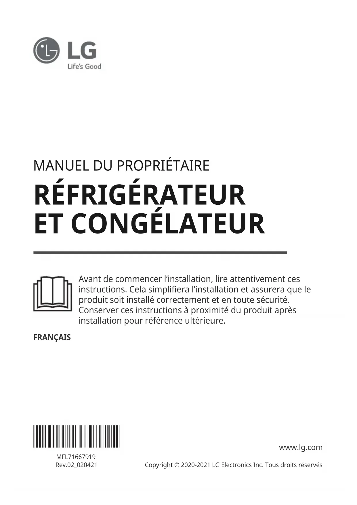 Avant de commencer l’installation, lire attentivement ces instructions. Cela simplifiera l’installation et assurera que le produit soit installé correctement et en toute sécurité. Conserver ces instructions à proximité du produit après installation pour référence ultérieure. FRANÇAIS MFL71667919 Rev.02_020421 www.lg.com Copyright © 2020-2021 LG Electronics Inc. Tous droits réservésTABLE DES MATIÈRES Ce manuel peut contenir des images ou un contenu différent du modèle que vous avez acheté. Ce manuel est sujet à révision par le fabricant.