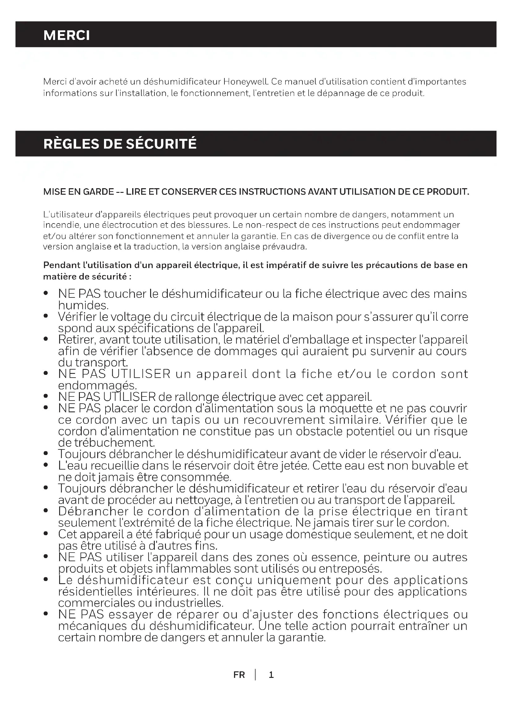 Merci d'avoir acheté un déshumidificateur Honeywell. Ce manuel d'utilisation contient d'importantes informations sur l'installation, le fonctionnement, l'entretien et le dépannage de ce produit. MISE EN GARDE -- LIRE ET CONSERVER CES INSTRUCTIONS AVANT UTILISATION DE CE PRODUIT. L'utilisateur d'appareils électriques peut provoquer un certain nombre de dangers, notamment un incendie, une électrocution et des blessures. Le non-respect de ces instructions peut endommager et/ou altérer son fonctionnement et annuler la garantie. En cas de divergence ou de conflit entre la version anglaise et la traduction, la version anglaise prévaudra. Pendant l'utilisation d'un appareil électrique, il est impératif de suivre les précautions de base en matière de sécurité :