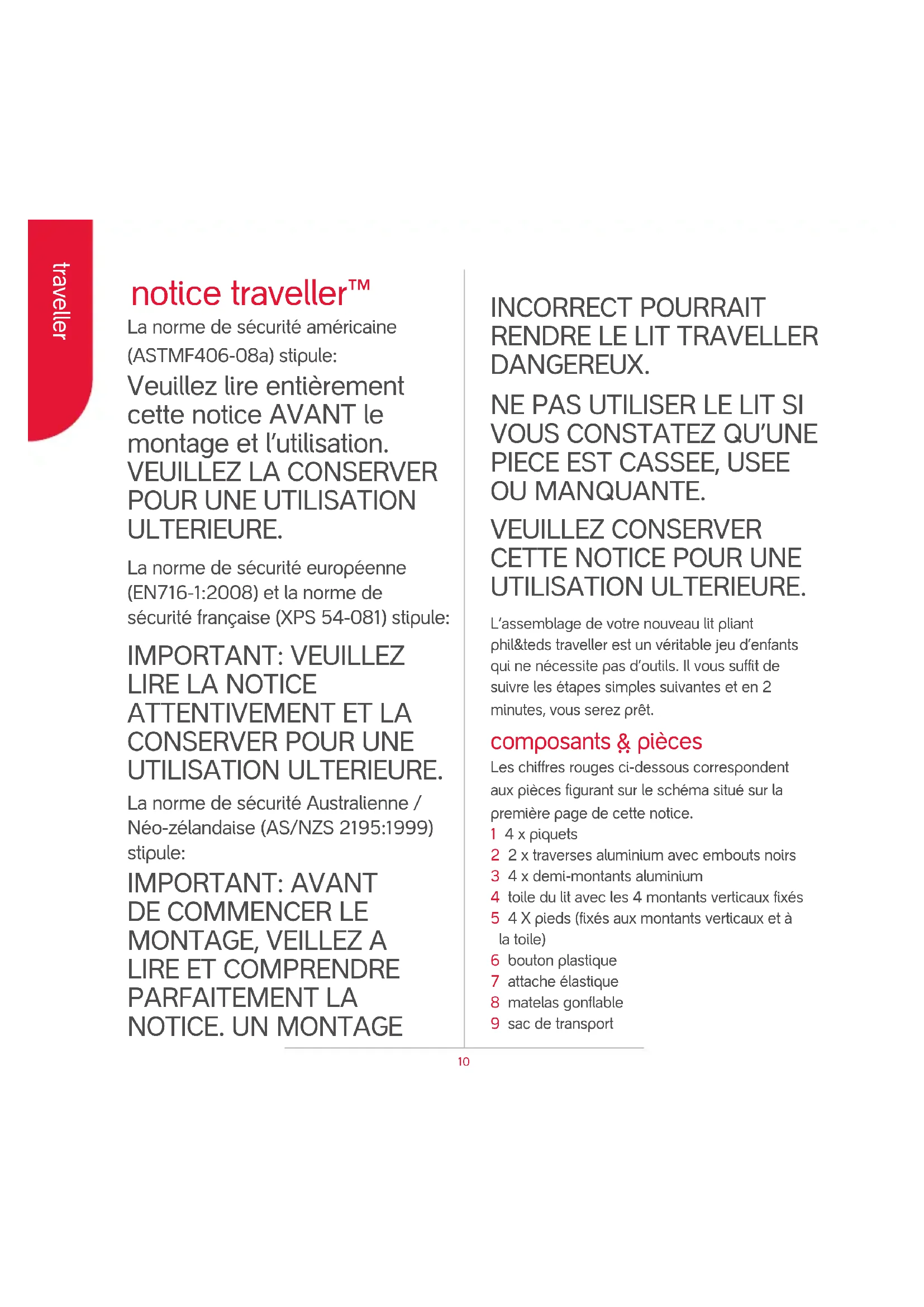 UTILISATION ULTERIEURE. L’assemblage de votre nouveau lit pliant phil&teds traveller est un véritable jeu d’enfants qui ne nécessite pas d’outils. Il vous suffit de suivre les étapes simples suivantes et en 2 minutes, vous serez prêt. composants ~ pièces Les chiffres rouges ci-dessous correspondent aux pièces figurant sur le schéma situé sur la première page de cette notice. 1 4 x piquets 2 2 x traverses aluminium avec embouts noirs 3 4 x demi-montants aluminium 4 toile du lit avec les 4 montants verticaux fixés 5 4 X pieds (fixés aux montants verticaux et à la toile) 6 bouton plastique 7 attache élastique 8 matelas gonflable 9 sac de transport 10français qualité ~ sécurité Ce produit est conforme aux normes de sécurité suivantes :