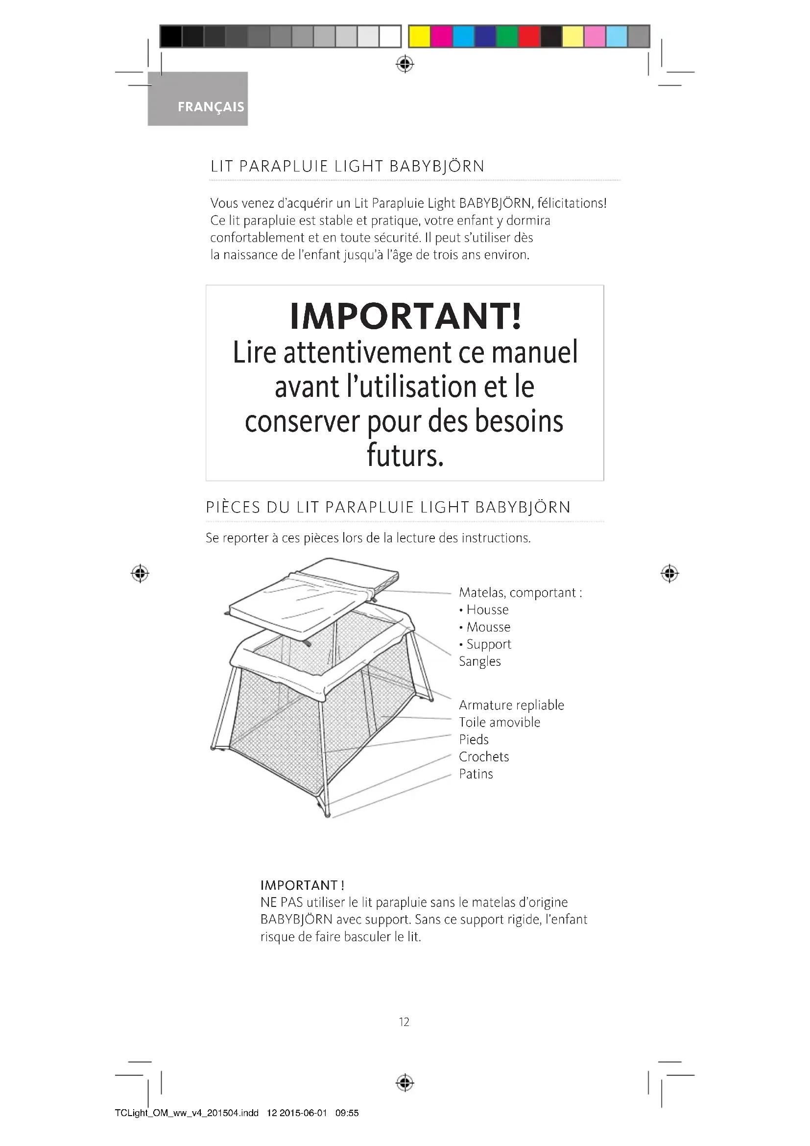 Vous venez d’acquérir un Lit Parapluie Light BABYBJÖRN, félicitations! Ce lit parapluie est stable et pratique, votre enfant y dormira confortablement et en toute sécurité. Il peut s’utiliser dès la naissance de l’enfant jusqu’à l’âge de trois ans environ. FRANÇAIS IMPORTANT! Lire attentivement ce manuel avant l’utilisation et le conserver pour des besoins futurs. TCLight_OM_ww_v4_201504.indd 12 2015-06-01 09:5513