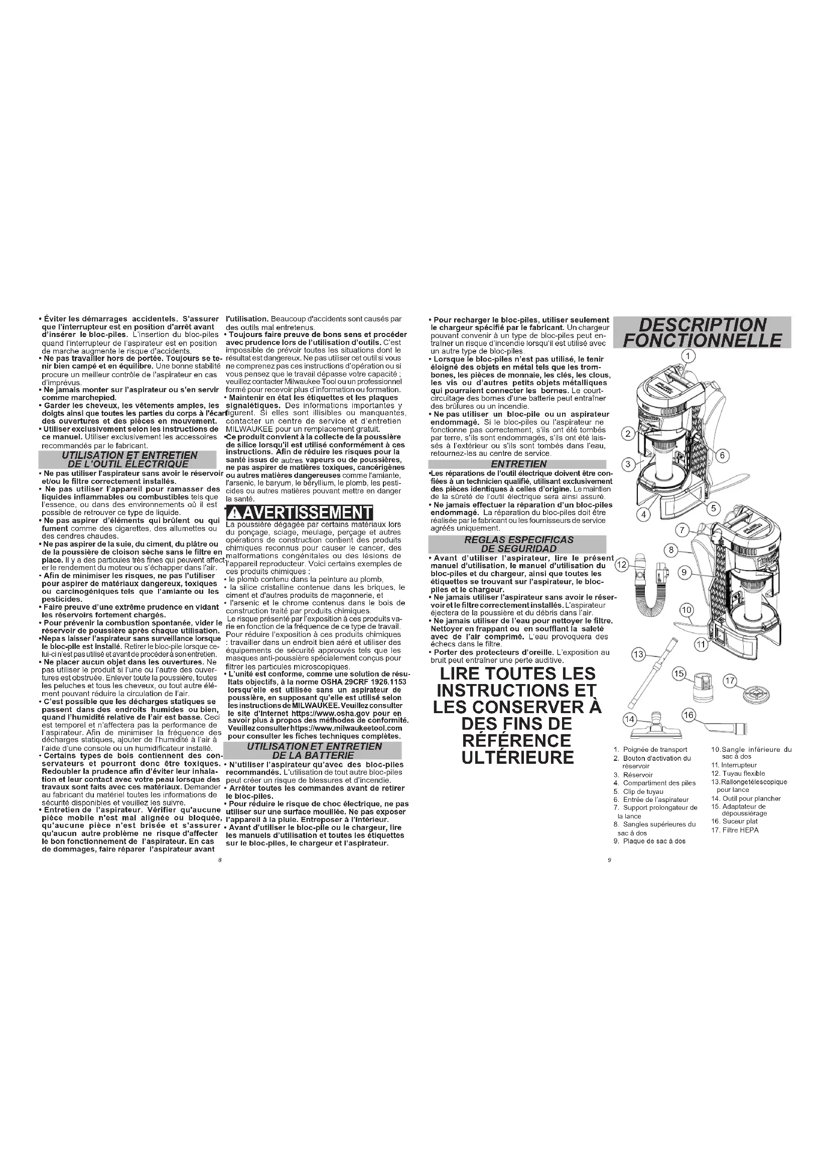 - Ne pas utiliser l'aspirateur sans avoir le réservoir et/ou le ltre correctement installés.• Ne pas utiliser l’appareil pour ramasser des liquides inammables ou combustibles tels que l’essence, ou dans des environnements où il est possible de retrouver ce type de liquide.• Ne pas aspirer d’éléments qui brûlent ou qui fument comme des cigarettes, des allumettes ou des cendres chaudes.• Ne pas aspirer de la suie, du ciment, du plâtre ou de la poussière de cloison sèche sans le ltre en place. Il y a des particules très nes qui peuvent affect-er le rendement du moteur ou s’échapper dans l’air.• An de minimiser les risques, ne pas l’utiliser pour aspirer de matériaux dangereux, toxiques ou carcinogéniques tels que l’amiante ou les pesticides. • Faire preuve d’une extrême prudence en vidant les réservoirs fortement chargés.• Pour prévenir la combustion spontanée, vider le réservoir de poussière après chaque utilisation.• Ne pas laisser l’aspirateur sans surveillance lorsque le bloc-pile est installé. Retirer le bloc-pile lorsque ce-lui-ci n’est pas utilisé et avant de procéder à son entretien.• Ne placer aucun objet dans les ouvertures. Ne pas utiliser le produit si l’une ou l’autre des ouver-tures est obstruée. Enlever toute la poussière, toutes les peluches et tous les cheveux, ou tout autre élé-ment pouvant réduire la circulation de l’air.• C’est possible que les décharges statiques se passent dans des endroits humides ou bien, quand l’humidité relative de l’air est basse. Ceci est temporel et n’affectera pas la performance de l’aspirateur. An de minimiser la fréquence des décharges statiques, ajouter de l’humidité à l’air à l’aide d’une console ou un humidicateur installé.• Certains types de bois contiennent des con-servateurs et pourront donc être toxiques. Redoubler la prudence an d’éviter leur inhala-tion et leur contact avec votre peau lorsque des travaux sont faits avec ces matériaux. Demander au fabricant du matériel toutes les informations de sécurité disponibles et veuillez les suivre.• Entretien de l’aspirateur. Vérifier qu'aucune pièce mobile n'est mal alignée ou bloquée, qu'aucune pièce n'est brisée et s'assurer qu'aucun autre problème ne risque d'affecter le bon fonctionnement de l’aspirateur. En cas de dommages, faire réparer l’aspirateur avant 10.Sangle inférieure du sac à dos11. Interrupteur12. Tuyau exible13. Rallonge télescopique pour lance14. Outil pour plancher15. Adaptateur de dépoussiérage16. Suceur plat17. Filtre HEPA10