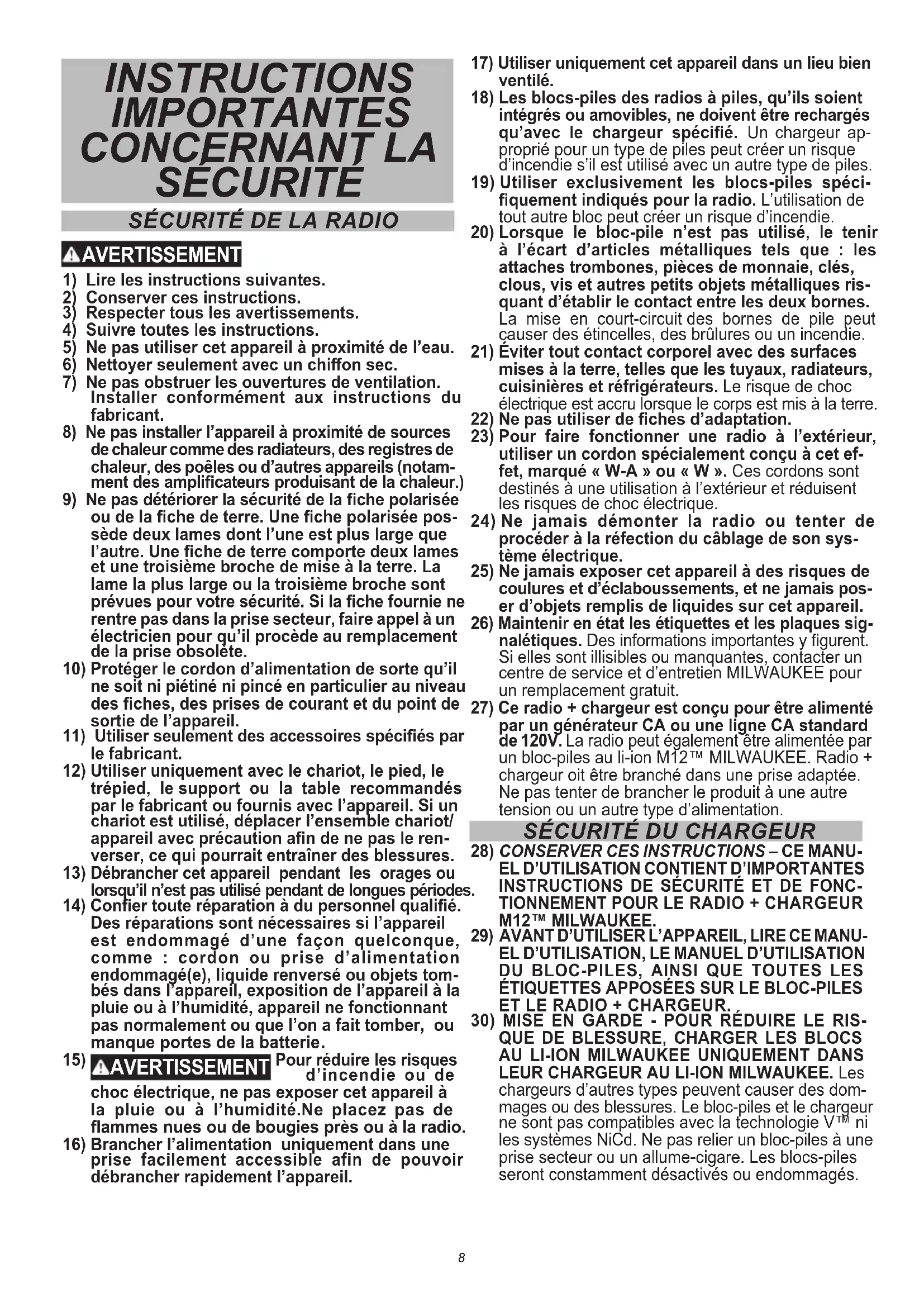 par un générateur CA ou une ligne CA standard de 120V. La radio peut également être alimentée par un bloc-piles au li-ion M12™ MILWAUKEE. Radio + chargeur oit être branché dans une prise adaptée. Ne pas tenter de brancher le produit à une autre tension ou un autre type d’alimentation.