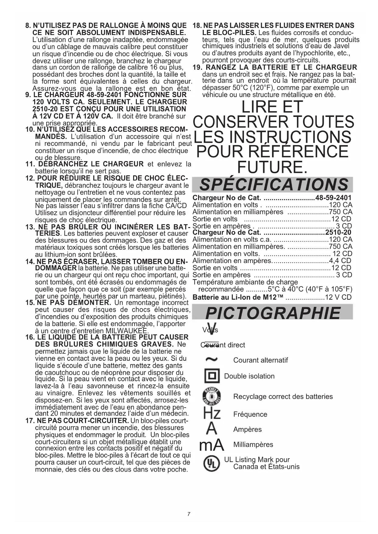 CHARGEURS AU LI-ION M12™ DE MILWAUKEE. L’utilisation d’autres types de chargeurs peut en- traîner des blessures ou causer des dommages. Ne pas relier les batteries à une prise de courant ou à un allume-cigarette. Elles resteront déchar- gées en permanence ou seront endommagées.