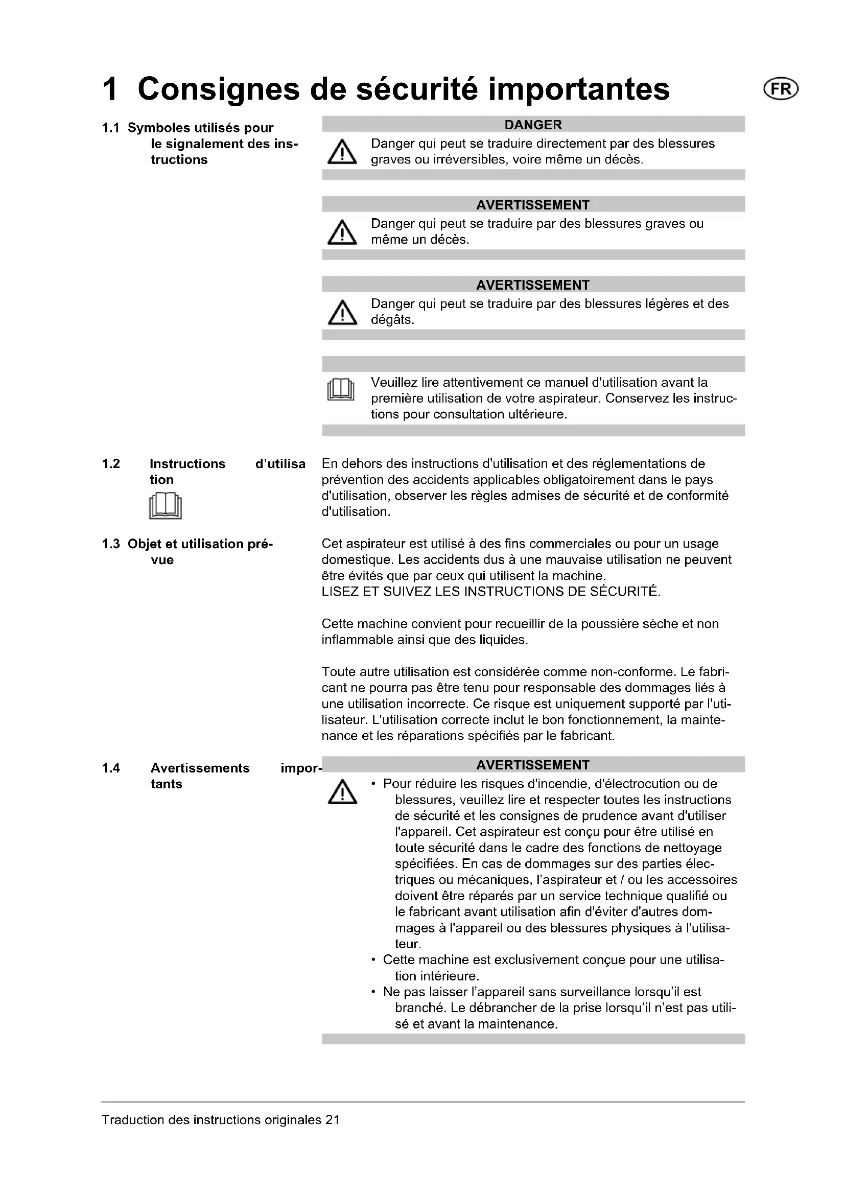 tants 1 Consignes de sécurité importantes Veuillez lire attentivement ce manuel d'utilisation avant la première utilisation de votre aspirateur. Conservez les instruc- tions pour consultation ultérieure.Traduction des instructions originales22 AVERTISSEMENT