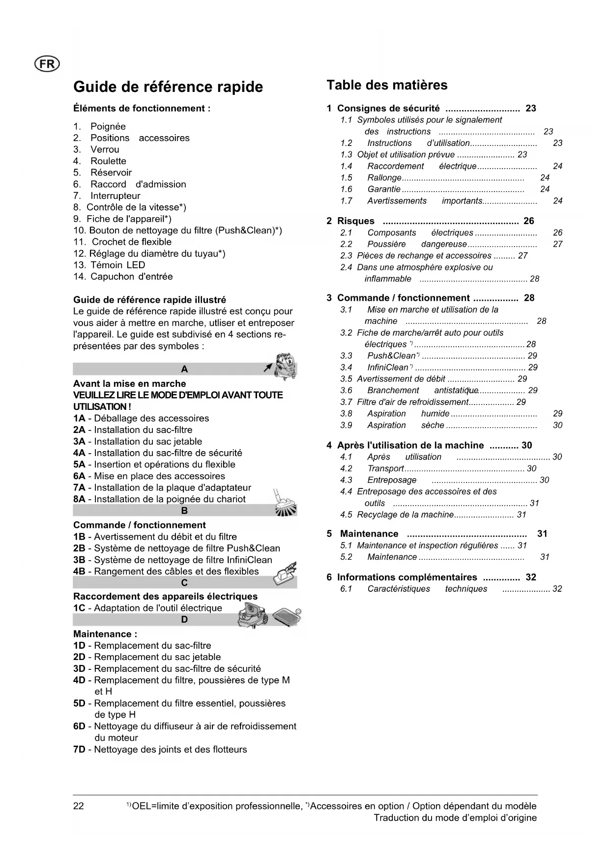 lorsque l'interrupteur électrique est en position , c.-à-d. la machine peut être utilisée comme rallonge. En position , la machine peut être mise en marche et arrêtée via l'outil connecté. La poussière est immédiatement aspirée à la source. Afin de sa- tisfaire aux règlementations en vigueur, seuls des outils électriques générant de la poussière approu- vés peuvent être branchés sur l'aspirateur.1) OEL=limite d’exposition professionnelle,
