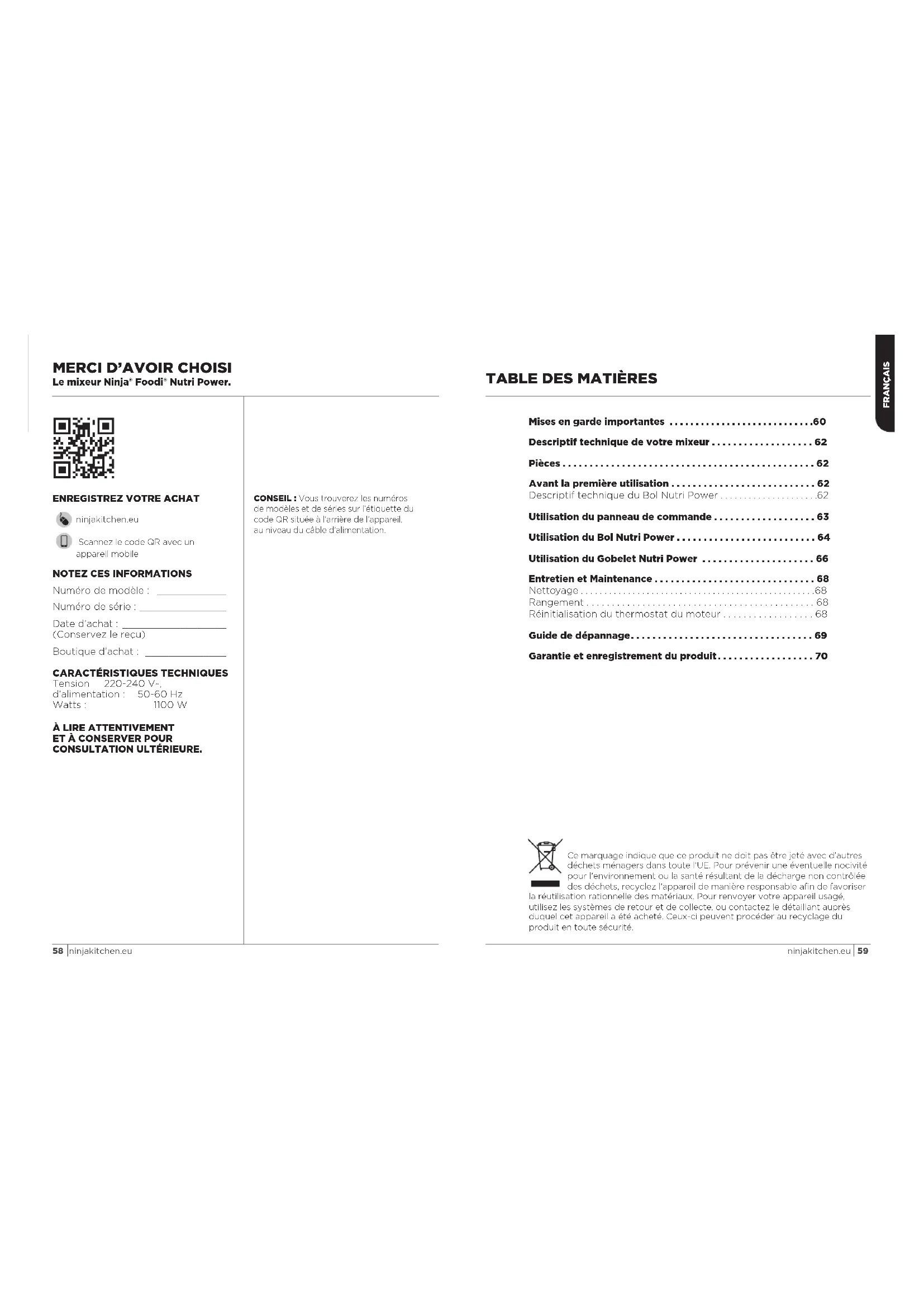 - Le mixeur Ninja® Foodi® Nutri Power Mises en garde importantes 60 Descriptif technique de votre mixeur 62 Pièces 62 Avant la première utilisation 62 Descriptif technique du Bol Nutri Power p. 62