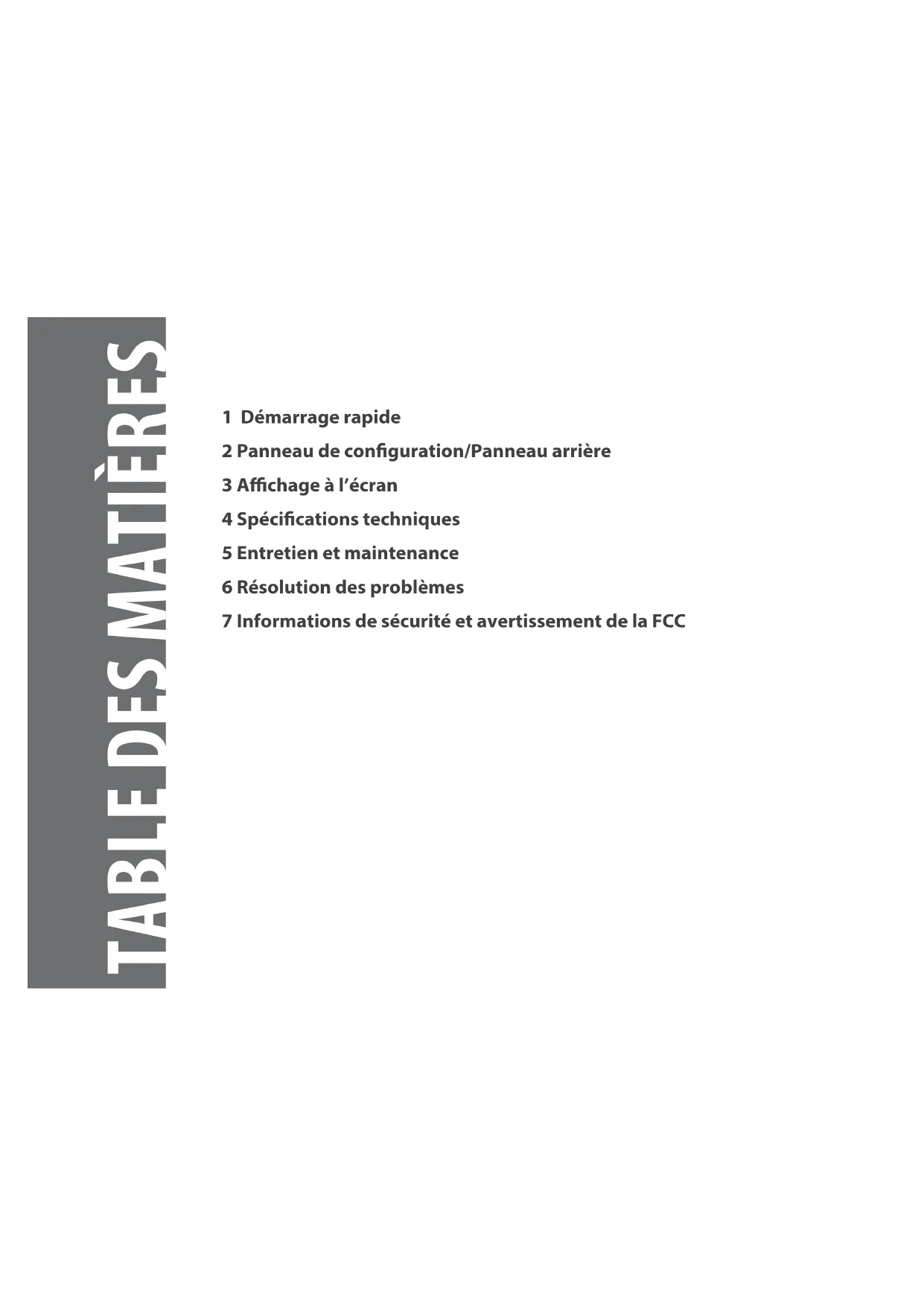L27ADS Moniteur LED wide Full HD 27pouces (68,6cm)TABLE DES MATIÈRES 1 Démarrage rapide 2 Panneau de conguration/Panneau arrière 3 Achage à l’écran 4 Spécications techniques 5 Entretien et maintenance 6 Résolution des problèmes 7 Informations de sécurité et avertissement de la FCC1