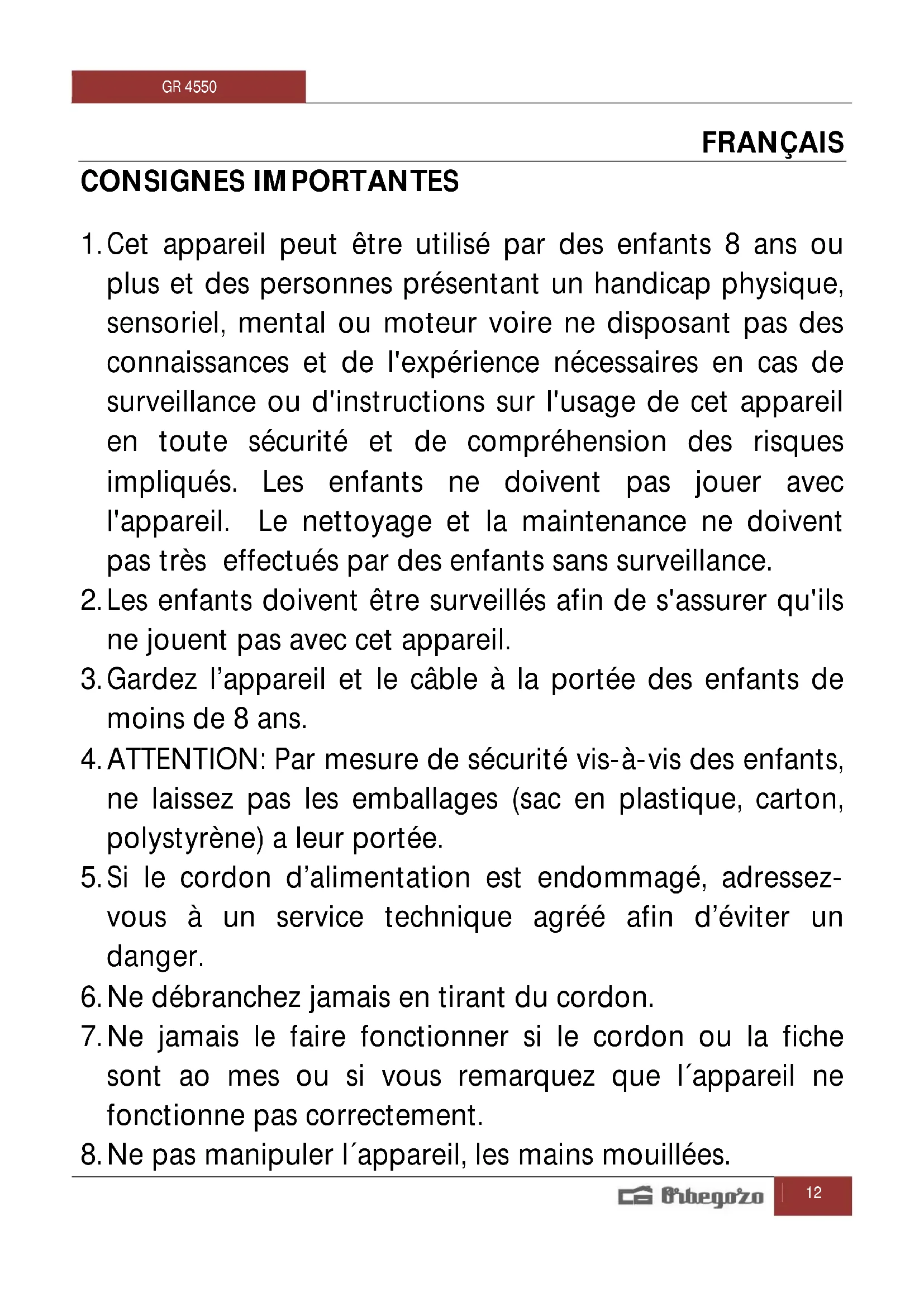 8. Ne pas manipuler l´appareil, les mains mouillées.GR 4550