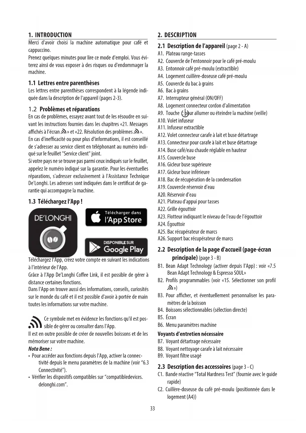principale) (page 3 - B) B1. Bean Adapt Technology (activer depuis l’App): voir «7.5 Bean Adapt Technology & Espresso SOUL» B2. Prols programmables (voir «15. Sélectionner son prol u») B3. Pour acher, et éventuellement personnaliser les para- mètres de la boisson B4. Boissons sélectionnables (sélection directe) B5. Écran B6. Menu paramètres machine Voyants d’entretien nécessaire B7. Voyant détartrage nécessaire B8. Voyant nettoyage carafe à lait nécessaire B9. Voyant ltre usagé