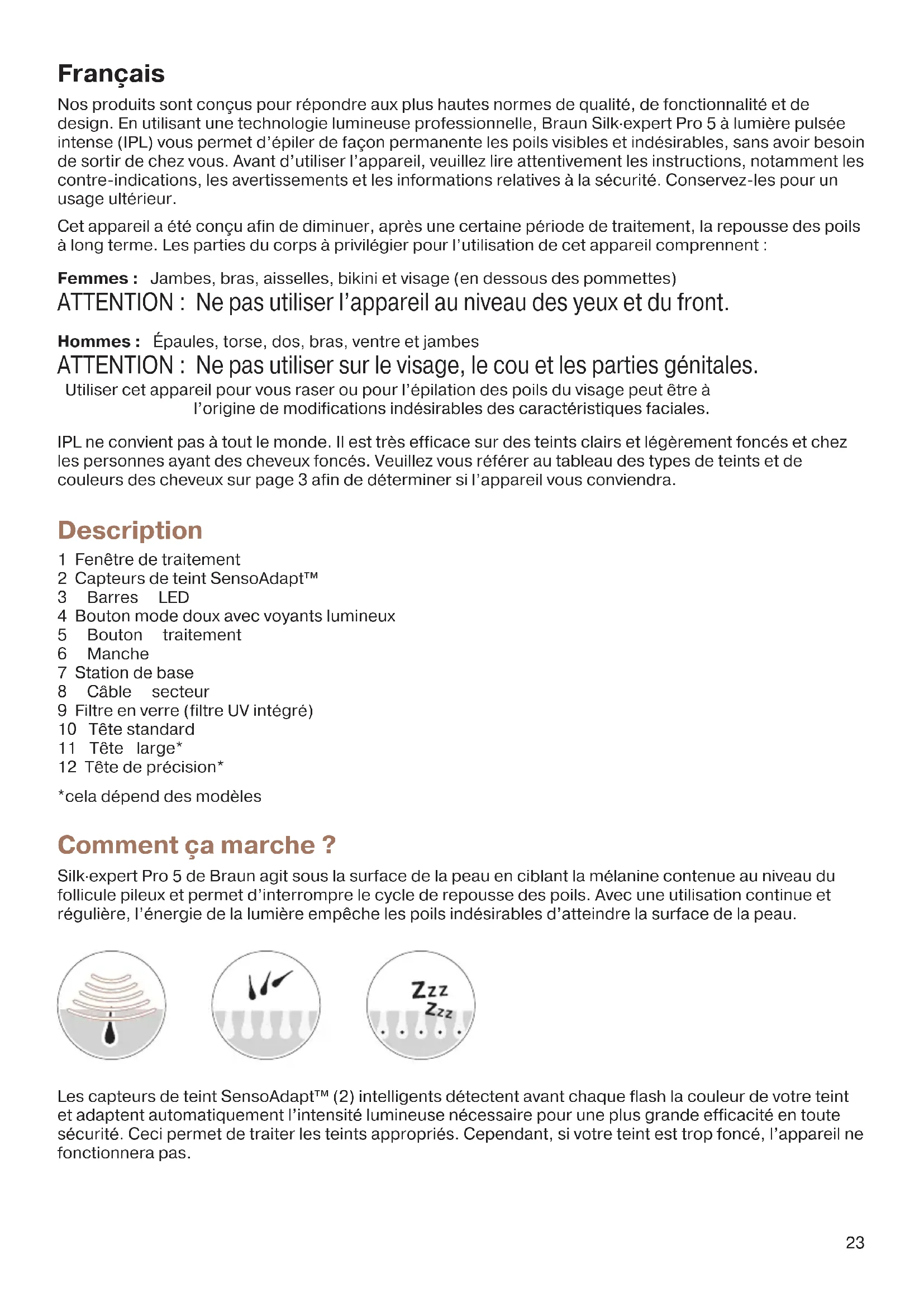 Transport Conditions: Temperature range: – 25°C to 70°C Humidity: up to 93% R.H. non-condensing Pressures: 500 hPa to 1060 hPa The device includes 400,000 flashes and is intended for use up to 6 years by a single user. This device complies with the standards IEC 60601-1:2005/A2:2012, CAN/CSA-C22.2 No. 60601-1:2014, ANSI/AAMI ES60601-1:2005 / A1:2012, IEC 60601-1-11:2015, IEC 60601-2-57:2011, EN 55014-1:2017, EN 55014-2:2015, EN 61000-3-2:2014, EN 61000-3-3:2013. Subject to change without notice. Guarantee We grant a 2-year guarantee on the product commencing on the date of purchase. Within the guarantee period we will eliminate any defects in the appliance resulting from faults in materials or workmanship, free of charge either by repairing or replacing the complete appliance at our discretion. Depending on availability replacement might result in a different color or an equivalent model. This guarantee extends to every country where this appliance is supplied by Braun or its appointed distributor. This guarantee does not cover: damage due to improper use, normal wear and tear (e.g. shaver foil or cutter block) as well as defects that have a negligible effect on the value or operation of the appliance. The guarantee becomes void if repairs are undertaken by unauthorised persons and if original Braun parts are not used. To obtain service within the guarantee period, hand in or send the complete appliance with your sales receipt to an authorised Braun Customer Service Centre (address information available online at www.service.braun.com). For UK only: This guarantee in no way affects your rights under statutory law. 91590833_Victoria2_PL5_Euro1.indd 2291590833_Victoria2_PL5_Euro1.indd 22 30.10.20 13:4230.10.20 13:4223 Français Nos produits sont conçus pour répondre aux plus hautes normes de qualité, de fonctionnalité et de design. En utilisant une technologie lumineuse professionnelle, Braun Silk·expert Pro 5 à lumière pulsée intense (IPL) vous permet d’épiler de façon permanente les poils visibles et indésirables, sans avoir besoin de sortir de chez vous. Avant d’utiliser l’appareil, veuillez lire attentivement les instructions, notamment les contre-indications, les avertissements et les informations relatives à la sécurité. Conservez-les pour un usage ultérieur. Cet appareil a été conçu afin de diminuer, après une certaine période de traitement, la repousse des poils à long terme. Les parties du corps à privilégier pour l’utilisation de cet appareil comprennent : Femmes : Jambes, bras, aisselles, bikini et visage (en dessous des pommettes) ATTENTION : Ne pas utiliser l’appareil au niveau des yeux et du front. Hommes : Épaules, torse, dos, bras, ventre et jambes ATTENTION : Ne pas utiliser sur le visage, le cou et les parties génitales. Utiliser cet appareil pour vous raser ou pour l’épilation des poils du visage peut être à l’origine de modifications indésirables des caractéristiques faciales. IPL ne convient pas à tout le monde. Il est très efficace sur des teints clairs et légèrement foncés et chez les personnes ayant des cheveux foncés. Veuillez vous référer au tableau des types de teints et de couleurs des cheveux sur page 3 afin de déterminer si l’appareil vous conviendra. Description 1 Fenêtre de traitement 2 Capteurs de teint SensoAdapt™ 3 Barres LED 4 Bouton mode doux avec voyants lumineux 5 Bouton traitement 6 Manche 7 Station de base 8 Câble secteur 9 Filtre en verre (filtre UV intégré) 10 Tête standard 11 Tête large* 12 Tête de précision* *cela dépend des modèles Comment ça marche ? Silk·expert Pro 5 de Braun agit sous la surface de la peau en ciblant la mélanine contenue au niveau du follicule pileux et permet d’interrompre le cycle de repousse des poils. Avec une utilisation continue et régulière, l’énergie de la lumière empêche les poils indésirables d’atteindre la surface de la peau. Les capteurs de teint SensoAdapt™ (2) intelligents détectent avant chaque flash la couleur de votre teint et adaptent automatiquement l’intensité lumineuse nécessaire pour une plus grande efficacité en toute sécurité. Ceci permet de traiter les teints appropriés. Cependant, si votre teint est trop foncé, l’appareil ne fonctionnera pas. 91590833_Victoria2_PL5_Euro1.indd 2391590833_Victoria2_PL5_Euro1.indd 23 30.10.20 13:4230.10.20 13:4224 Contre-Indications Ne pas utiliser l’appareil ...