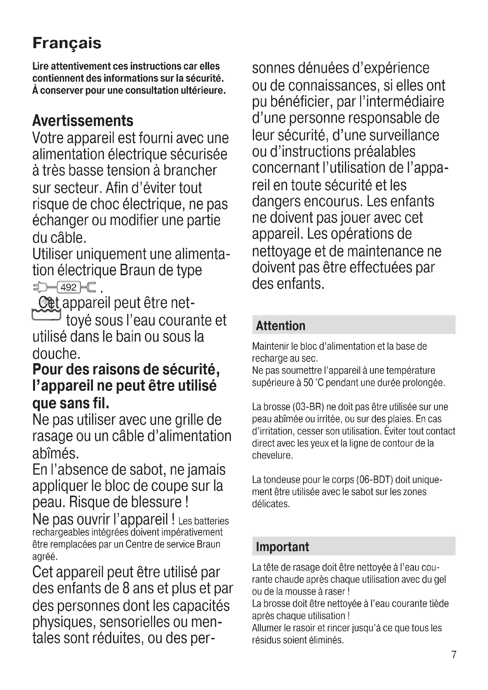 Cet appareil peut être net- toyé sous l’eau courante et utilisé dans le bain ou sous la douche. Pour des raisons de sécurité, l’appareil ne peut être utilisé que sans fil. Ne pas utiliser avec une grille de rasage ou un câble d’alimentation abîmés. En l’absence de sabot, ne jamais appliquer le bloc de coupe sur la peau. Risque de blessure ! Ne pas ouvrir l’appareil ! Les batteries rechargeables intégrées doivent impérativement être remplacées par un Centre de service Braun agréé. Cet appareil peut être utilisé par des enfants de 8 ans et plus et par des personnes dont les capacités physiques, sensorielles ou men- tales sont réduites, ou des per- sonnes dénuées d’expérience ou de connaissances, si elles ont pu bénéficier, par l’intermédiaire d’une personne responsable de leur sécurité, d’une surveillance ou d’instructions préalables concernant l’utilisation de l’appa- reil en toute sécurité et les dangers encourus. Les enfants ne doivent pas jouer avec cet appareil. Les opérations de nettoyage et de maintenance ne doivent pas être effectuées par des enfants. Attention Maintenir le bloc d’alimentation et la base de recharge au sec. Ne pas soumettre l’appareil à une température supérieure à 50 °C pendant une durée prolongée. La brosse (03-BR) ne doit pas être utilisée sur une peau abîmée ou irritée, ou sur des plaies. En cas d’irritation, cesser son utilisation. Éviter tout contact direct avec les yeux et la ligne de contour de la chevelure. La tondeuse pour le corps (06-BDT) doit unique- ment être utilisée avec le sabot sur les zones délicates. Important La tête de rasage doit être nettoyée à l’eau cou- rante chaude après chaque utilisation avec du gel ou de la mousse à raser ! La brosse doit être nettoyée à l’eau courante tiède après chaque utilisation ! Allumer le rasoir et rincer jusqu’à ce que tous les résidus soient éliminés. 91940941_S7_EURO.indd 791940941_S7_EURO.indd 7 04.01.19 09:2804.01.19 09:28 Business Use - P&G AUTHORIZED POA-00096223 Rev 001 Effective Date 2019-01-04 Printed 2020-03-20 Page 7 of 56Business Use - P&G AUTHORIZED POA-00096223 Rev 001 Effective Date 2019-01-04 Printed 2020-03-20 Page 7 of 568 Pour des raisons d’hygiène, ne pas partager l’appa- reil avec d’autres personnes. Ce produit contient des piles et / ou des déchets électriques recyclables. Pour la protection de l’environnement, ne pas jeter avec les ordures ménagères, mais les porter dans les points de recyclage de déchets électriques disponibles dans votre pays. Sujet à des modifications sans préavis. 91940941_S7_EURO.indd 891940941_S7_EURO.indd 8 04.01.19 09:2804.01.19 09:28 Business Use - P&G AUTHORIZED POA-00096223 Rev 001 Effective Date 2019-01-04 Printed 2020-03-20 Page 8 of 56Business Use - P&G AUTHORIZED POA-00096223 Rev 001 Effective Date 2019-01-04 Printed 2020-03-20 Page 8 of 569 Lea estas instrucciones completamente, ya que contienen información necesaria para su seguridad. Guárdelas para futuras consultas. Advertencias Esta máquina está provista de una fuente de alimentación integrada con SELV (voltaje extrabajo seguro). Para evitar el riesgo de recibir una descarga eléctrica, no reemplazar ni modificar ninguna de las piezas. Utilizar únicamente fuentes de alimentación Braun del tipo