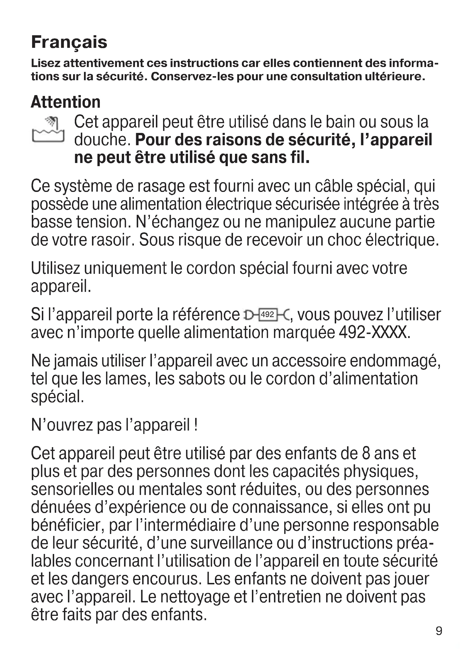 - Pour préserver le bon fonctionnement des accessoires, appliquez régu- lièrement une goutte d’huile de machine légère (non fournie) sur la ton- deuse et les grilles. Note environnementale Ce produit contient des piles et/ou des déchets électriques recyclables. Pour la protection de l’environnement, ne pas jeter avec les ordures ménagères, mais les porter dans les points de recyclage de déchets électriques disponibles dans votre pays. Sujet à des modifications sans préavis. Garantie Nous accordons une garantie de 2 ans sur ce produit, à partir de la date d’achat. Pendant la durée de la garantie, Braun prendra gratuitement à sa charge la réparation des vices de fabrication ou de matière en se réservant le droit de décider si certaines pièces doivent être réparées ou si l’appareil lui-même doit être échangé. En fonction de la disponibilité, le remplacement peut se faire dans une cou- leur différente ou au moyen d’un modèle équivalent. Cette garantie s’étend à tous les pays où cet appareil est commercialisé par Braun ou son distributeur exclusif. Cette garantie ne couvre pas : les dommages occasionnés par une utilisa- 90618559_MGK7221_7220_7920_MGK5280_CEEMEA.indd 1290618559_MGK7221_7220_7920_MGK5280_CEEMEA.indd 12 21.05.19 10:2921.05.19 10:29 Business Use - P&G AUTHORIZED POA-00133196 Rev 001 Effective Date 2019-05-24 Printed 2022-03-31 Page 12 of 8013 tion inadéquate, l’usure normale (par exemple, grille et bloc-couteaux) ainsi que les défauts d’usures qui ont un effet négligeable sur la valeur ou l’utili- sation de l’appareil. Cette garantie devient caduque si des réparations ont été effectuées par des personnes non agréées par Braun et si des pièces de rechange ne provenant pas de Braun ont été utilisées. Pour toute réclamation intervenant pendant la période de garantie, retour- nez ou rapportez l’appareil ainsi que l’attestation de garantie à votre reven- deur ou à un Centre Service Agréé Braun. Veuillez vous référer à www.service.braun.com ou appeler le 0 800 944 802 (service consommateurs – service & appel gratuits) pour connaître le Centre Service Agréé Braun le plus proche de chez vous. Clause spéciale pour la France Outre la garantie contractuelle exposée ci-dessus, nos clients bénéficient de la garantie légale des vices caches prévue aux articles 1641 et suivants du Code civil. 90618559_MGK7221_7220_7920_MGK5280_CEEMEA.indd 1390618559_MGK7221_7220_7920_MGK5280_CEEMEA.indd 13 21.05.19 10:2921.05.19 10:29 Business Use - P&G AUTHORIZED POA-00133196 Rev 001 Effective Date 2019-05-24 Printed 2022-03-31 Page 13 of 8014 Polski Niniejszą instrukcję należy przeczytać w całości, gdyż zawiera ona informacje dotyczące bezpieczeństwa. Należy ją zachować do późniejszego wglądu. Ostrzeżenia Urządzenia można używać w wannie bądź pod prysznicem. Ze względów bezpieczeństawa urządzenia należy używać tylko bezprzewodowo. Urządzenie jest wyposażone w specjalny przewód z wtyczką ze zintegrowanym, bezpiecznym zasilaczem o bardzo niskim napięciu. Nie należy wymieniać żadnej części urządzenia ani manipulować przy nim, w przeciwnym razie zaistnieje ryzyko porażenia prądem elektrycznym. Należy używać tylko specjalnego przewodu dołączonego do urządzenia. Jeśli urządzenie jest oznakowane kodem