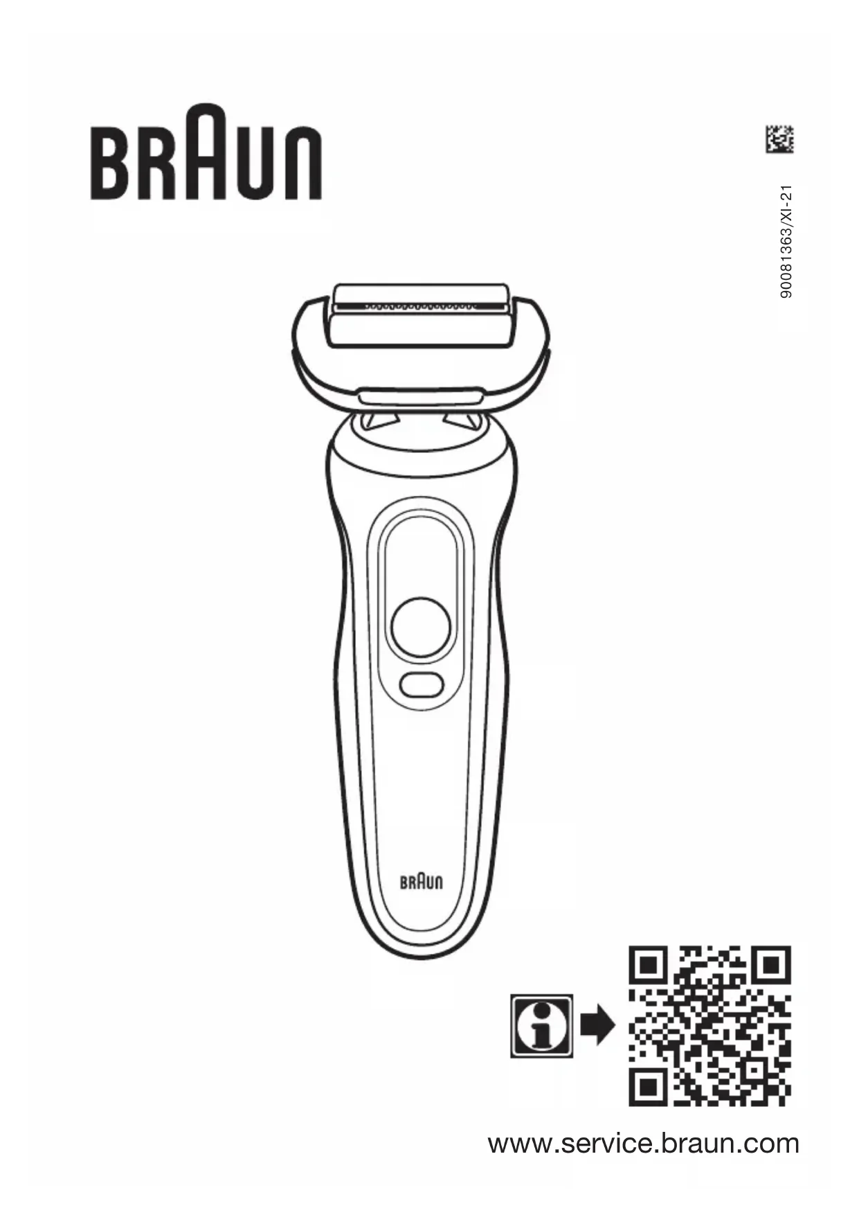 Ne pas utiliser si l’appareil ou un accessoire est endommagé. Ne pas ouvrir l’appareil ! Les batteries rechargeables intégrées doivent impérative- ment être remplacées par un centre de service agréé Braun. Cet appareil peut être utilisé par les enfants à partir de 8 ans et les personnes avec une réduction des capacités phy- siques, sensorielles ou men- tales, ou sans expérience et connaissances, s’ils ont béné- ficié d’une surveillance ou d’instructions concernant l’utilisation de l’appareil en toute sécurité et comprennent les dangers encourus. 90081363_UI_S7_Shaver+Attachments_EURO+KOREA.indd 2190081363_UI_S7_Shaver+Attachments_EURO+KOREA.indd 21 05.11.21 11:0305.11.21 11:0322 Si l’appareil est fourni avec un accessoire tondeuse à che- veux, il peut être utilisé par des enfants âgés de 3 ans et plus sous surveillance. Les enfants ne doivent pas jouer avec cet appareil. Les opérations de nettoyage et de maintenance ne doivent pas être effectuées par des enfants à moins qu’ils ne soient sous surveillance. Mise en garde La température ambiante recommandée pour la charge est comprise entre 5 à 35 °C. Pour le rangement et le rasage, entre 15 à 35 °C. Ne pas soumettre l’appareil à une tempéra- ture supérieure à 50 °C pendant une durée prolongée. La brosse (03-BR) ne doit pas être utilisée sur une peau endommagée ou irritée ou sur des lésions. En cas d’irritation, cesser son utilisation. Éviter tout contact direct avec les yeux et la ligne de contour des cheveux. La tondeuse pour le corps (06-BDT) doit être utilisée uniquement avec le sabot sur les zones délicates. Utiliser l’appareil uniquement dans le cadre de l’usage prévu. Pour des raisons d’hygiène, ne pas partager l’appareil avec d’autres personnes. Comment démarrer ? Pour la première activation, branchez le rasoir à une prise électrique. Débranchez ensuite pour l’utilisation. Comment se raser ? Positionnez la tête de rasoir à 90° sur votre peau pour que tous les éléments de rasage soient entièrement en contact avec la peau. Rasez-vous dans le sens opposé à la pousse de votre barbe avec des mouvements francs d’avant en arrière. Comment nettoyer ? La cassette de rasage doit être nettoyée à l’eau courante chaude après chaque utilisation avec du gel ou de la mousse à raser ! La brosse (03-BR) doit être nettoyée à l’eau courante tiède après chaque utilisation ! Allumer le rasoir et rincer jusqu’à ce que tous les résidus soient éliminés. Ensuite, le rasoir et la cassette de rasage peuvent être nettoyés ensemble dans la station de nettoyage. Ce produit contient des piles et / ou des déchets électriques recyclables. Pour la protection de l’environnement, ne pas jeter avec les ordures ménagères, mais les porter dans les points de recyclage de déchets électriques disponibles dans votre pays. Sujet à des modifications sans préavis. Description 1 Cassette de rasage 73S 2 Bouton marche/arrêt 3 Bouton Tableau de bord 4 Affichage - Indicateur de changement de la grille - Indicateur de verrou du rasoir - Indicateur de station de nettoyage - Indicateur de faible charge / utilisation sans fil - Indicateur de batterie - Barre d’état 5 Prise d’alimentation 6 Bloc d’alimentation 7 Etui 8 Capuchon de protection 9 Tondeuse de précision 02-PT 10 Tondeuse à barbe 05-BT avec sabots (1/2/3/5/7 mm) 11 Tondeuse pour le corps 06-BDT avec sabots (1 mm = sensible / 3 mm) 90081363_UI_S7_Shaver+Attachments_EURO+KOREA.indd 2290081363_UI_S7_Shaver+Attachments_EURO+KOREA.indd 22 05.11.21 11:0305.11.21 11:0323 12 Tondeuse à barbe de 3 jours 08-3DBT pour une barbe de 3 jours impeccable avec sabots 4 x 2 (0,5-2,3 mm) 13 Brosse nettoyante visage 03-BR avec capuchon de protection 14 Base de recharge 15 Station de nettoyage (description séparée) Les accessoires varient selon le modèle. Veuillez consulter l’emballage pour plus de détails. Español Lea estas instrucciones completamente, ya que contienen información necesaria para su seguridad. Guárdelas para futuras consultas. ADVERTENCIAS Este aparato puede lavarse con agua y es apto para usarlo en la bañera o en la ducha. Por motivos de seguridad, solo puede utilizarse sin cable. No olvide desconectar la afeita- dora de la fuente de alimenta- ción antes de usarla con agua. Mantener la fuente de alimentación, la base de carga y la estación de limpieza secas. Este aparato está provisto de un cable de alimentación con transformador integrado SELV (Extrabajo Voltaje de Seguri- dad). No reemplazar ni mani- pular ninguno de sus compo- nentes; de lo contrario podría correrse riesgo de descarga eléctrica. Utilizar únicamente fuentes de alimentación Braun del tipo