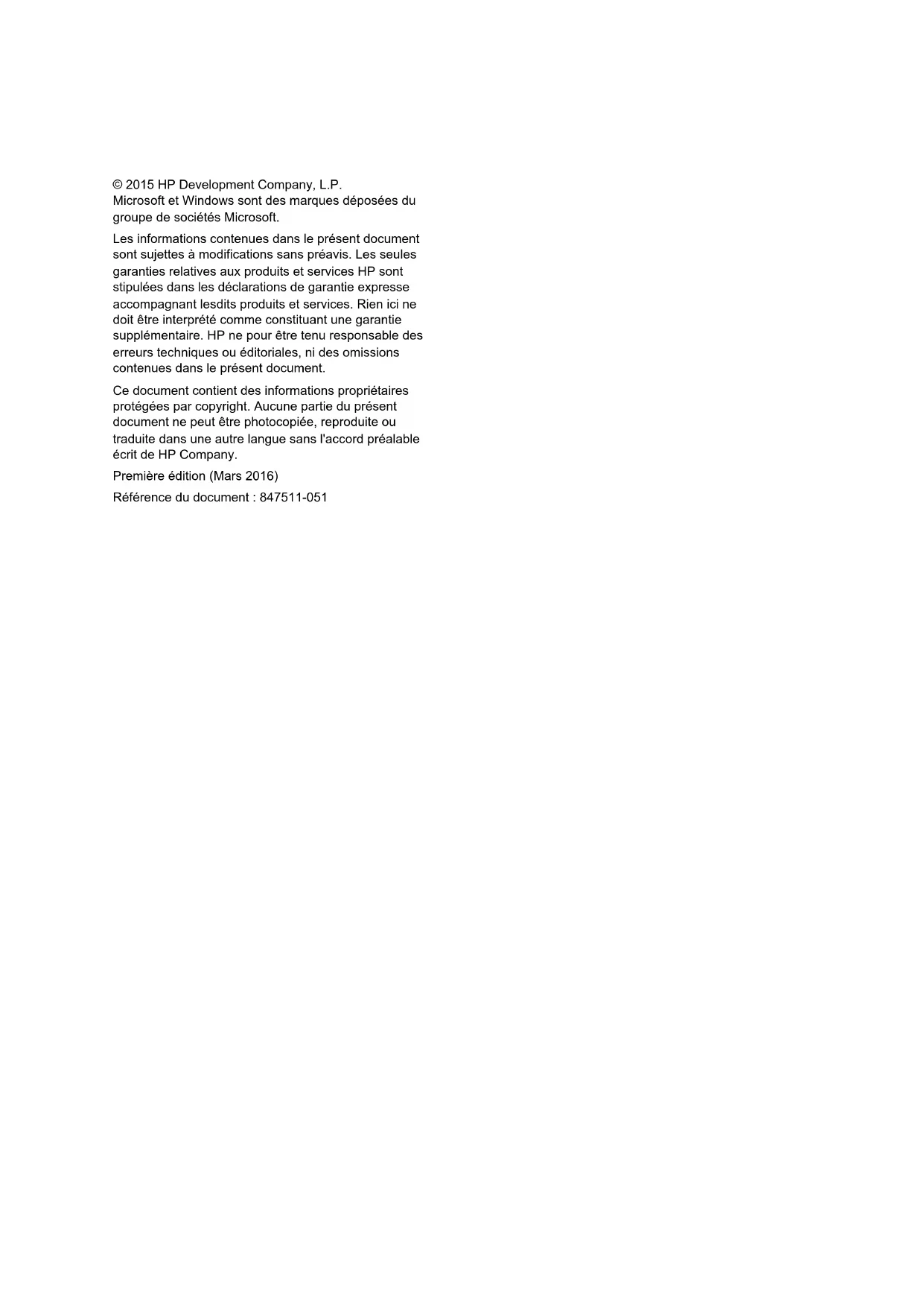 Guide d'utilisation© 2015 HP Development Company, L.P. Microsoft et Windows sont des marques déposées du groupe de sociétés Microsoft. Les informations contenues dans le présent document sont sujettes à modifications sans préavis. Les seules garanties relatives aux produits et services HP sont stipulées dans les déclarations de garantie expresse accompagnant lesdits produits et services. Rien ici ne doit être interprété comme constituant une garantie supplémentaire. HP ne pour être tenu responsable des erreurs techniques ou éditoriales, ni des omissions contenues dans le présent document. Ce document contient des informations propriétaires protégées par copyright. Aucune partie du présent document ne peut être photocopiée, reproduite ou traduite dans une autre langue sans l'accord préalable écrit de HP Company. Première édition (Mars 2016) Référence du document : 847511-051ii Au sujet du présent guide Ce guide fournit des informations sur les caractéristiques du moniteur, la configuration du moniteur, l'utilisation des logiciels et les caractéristiques techniques. ATTENTION ! Le texte présenté de cette manière indique que le non respect des instructions peut entraîner des blessures corporelles ou le décès. MISE EN GARDE : Le texte présenté de cette manière indique que le non respect des instructions peut entraîner des dégâts matériels ou la perte d'informations. REMARQUE : Le texte présenté de cette manière fournit des informations supplémentaires importantes.ENWW 1 Table des matières Au sujet du présent guide