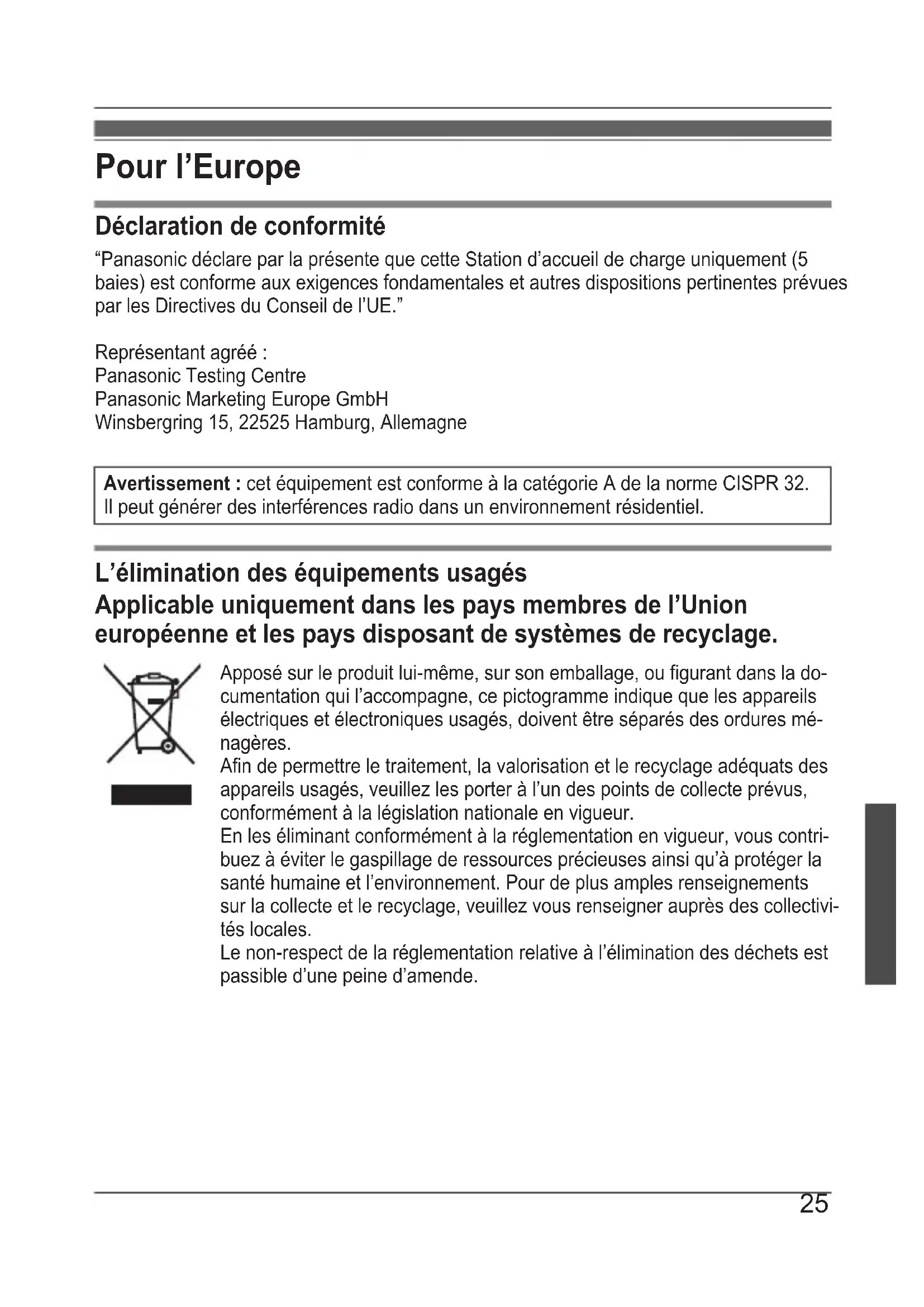 Il peut générer des interférences radio dans un environnement résidentiel. L’élimination des équipements usagés Applicable uniquement dans les pays membres de l’Union européenne et les pays disposant de systèmes de recyclage. Apposé sur le produit lui-même, sur son emballage, ou figurant dans la do- cumentation qui l’accompagne, ce pictogramme indique que les appareils électriques et électroniques usagés, doivent être séparés des ordures mé- nagères. Afin de permettre le traitement, la valorisation et le recyclage adéquats des appareils usagés, veuillez les porter à l’un des points de collecte prévus, conformément à la législation nationale en vigueur. En les éliminant conformément à la réglementation en vigueur, vous contri- buez à éviter le gaspillage de ressources précieuses ainsi qu’à protéger la santé humaine et l’environnement. Pour de plus amples renseignements sur la collecte et le recyclage, veuillez vous renseigner auprès des collectivi- tés locales. Le non-respect de la réglementation relative à l’élimination des déchets est passible d’une peine d’amende. 25Table des matières Introduction page 26 Précautions de sécurité page 27 Manipulation et entretien page 29 Description des composants page 30 Connexions page 31 Installation/retrait de l’unité dans/de la station d’accueil page 32 Dépannage page 33 Caractéristiques techniques page 34 Introduction Ce produit est conçu pour être utilisé avec la gamme Panasonic FZ-N1 et FZ-F1 (ci-après dénommée “l’unité”) (à compter de février 2018). Il est possible de charger jusqu’à cinq unités à la fois. R Lisez également attentivement les Instructions d’utilisation de l’unité. Batteries compatibles R FZ-VZSUN110 R FZ-VZSUN120 Accessoires fournis R Adaptateur secteur (numéro de modèle CF-AA5713A) x 1 R Cordon secteur